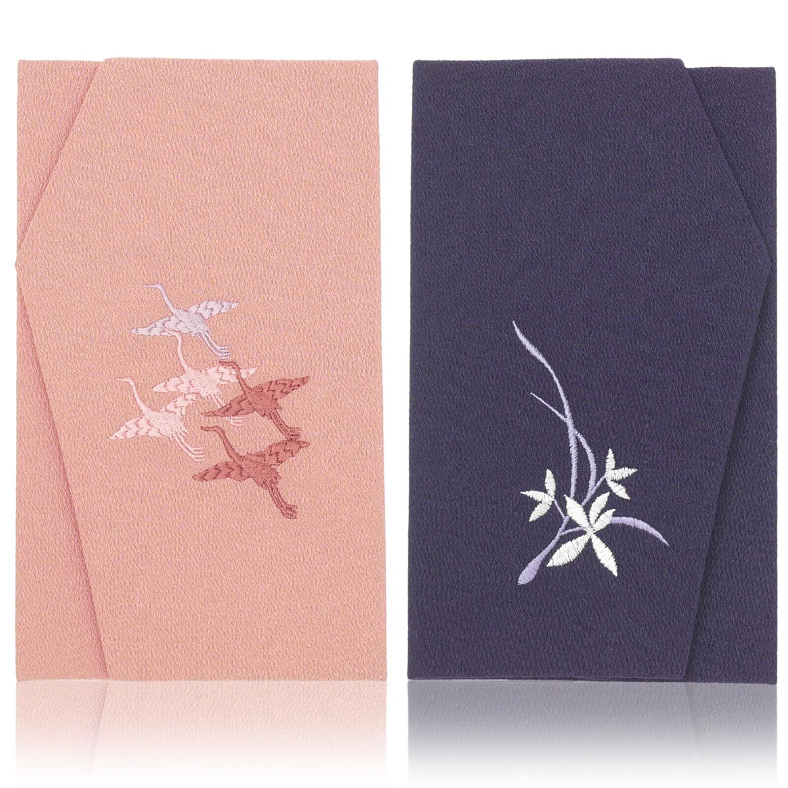 金封を挟むだけで利用できる、「はさみ袱紗」です。慶弔にご利用いただける2枚セットで、お祝い事には鶴、お悔み事には桔梗の伝統的な刺繍を施したデザインが特徴です。ピンクと紫の印象的で克つ落ち着いた色合いが魅力です。
