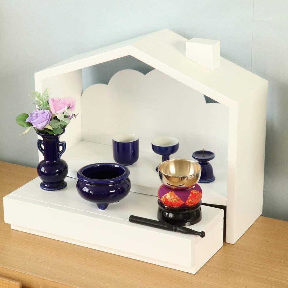 このセットは上置き仏壇やミニ仏壇に良く合います。陶器は岐阜県産で、瑠璃色の濃い紫みの鮮やかな青色が締まります。