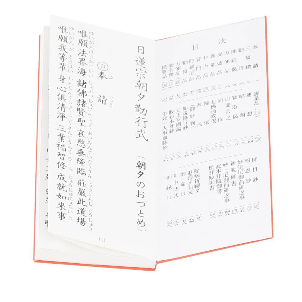 奉請、三寶禮、勧請、開経偈、方便品、提婆品、壽量品、神力品、普門品、陀羅尼品、勧發品、方便品(訓)、提婆品(訓)、壽量品(訓)、運想、唱題、寶塔偈、以要言之、回向、七佛通戒偈、帰依、奉送、如説修行鈔、立正安國論、観心本尊鈔、生死一大事血脉鈔、開目鈔、報恩鈔、妙法尼御前御返事、新池御書、妙一尼御前御返事、波木井殿御書、松野殿御書、除病祈祷文、追善回向文、御命日、年中法式、御縁日などが書かれています。