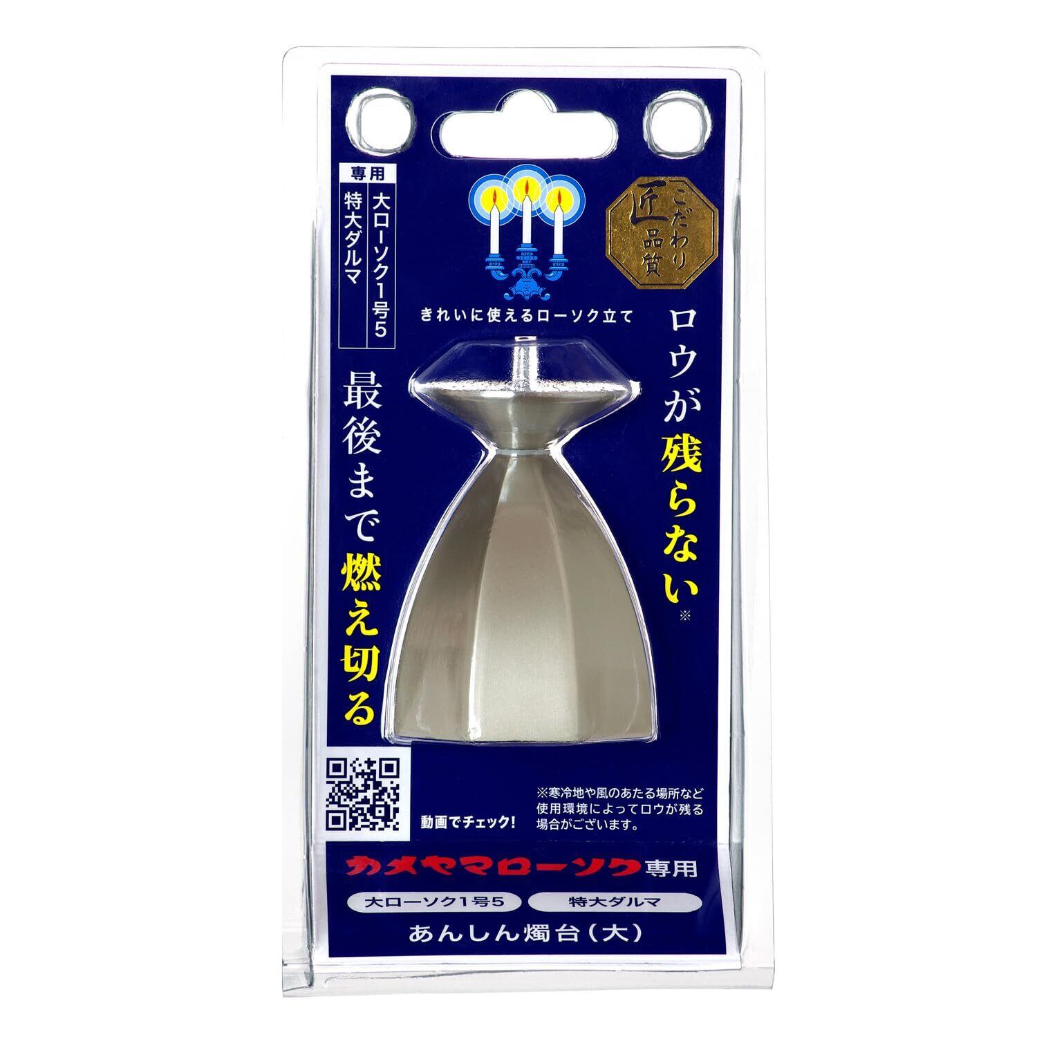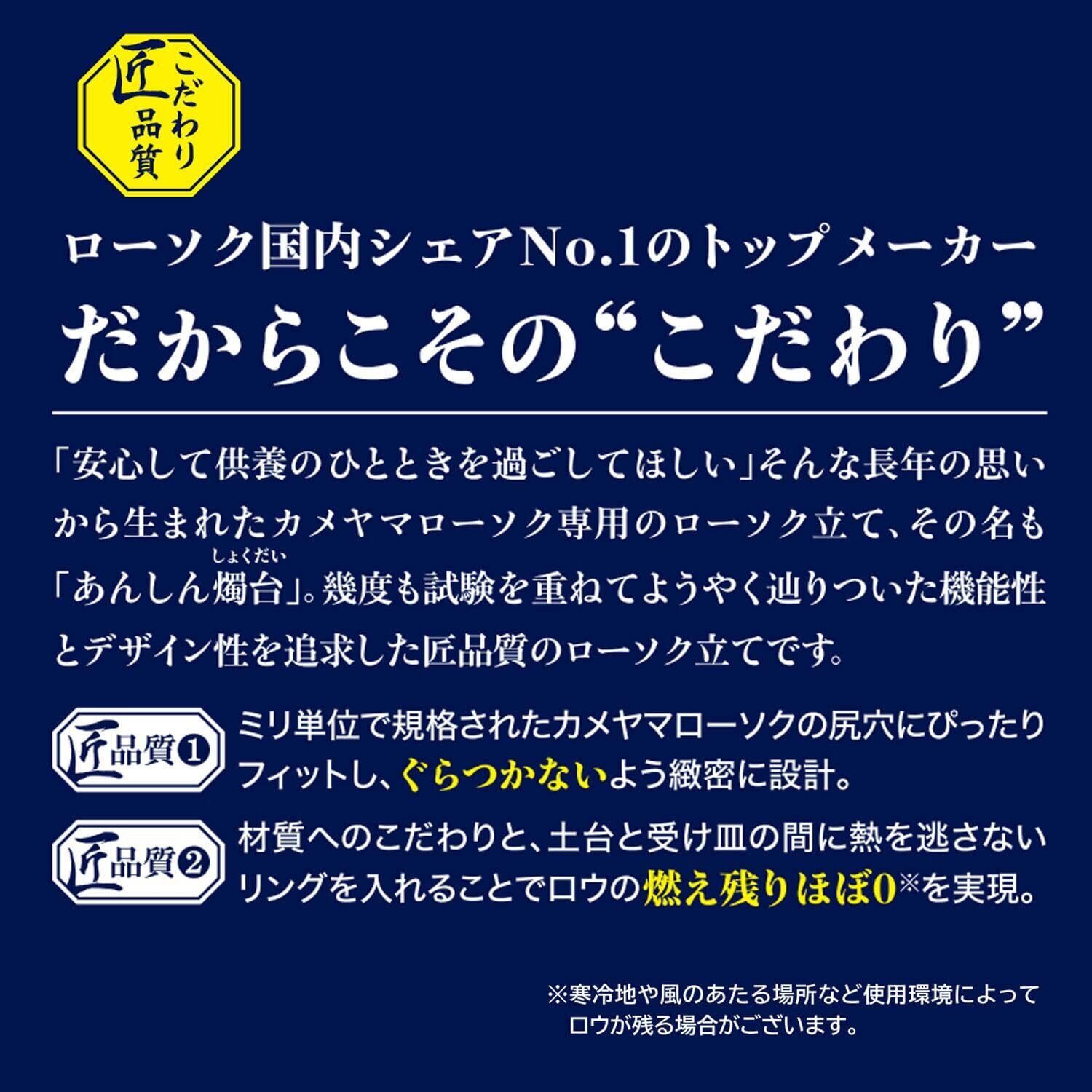 ●「安心して供養のひとときを過ごしてほしい」そんな長年の思いから生まれたカメヤマローソク専用のローソク立て、その名も「あんしん燭台」。●ロウが残らない(※1)、最後まで燃え切るよう、幾度も試験を重ねてようやく辿りついた機能性とデザイン性を追求した匠品質のローソク立てです。●適合ローソク…大ローソク1号5、特大ダルマ●ミリ単位で規格されたカメヤマローソクの尻穴にぴったりフィットし、ぐらつかないよう緻密に設計。●材質へのこだわりと、土台の受け皿の間に熱を逃さないリングを入れることでロウの燃え残りほぼ0を実現。※1…寒冷地や風のあたる場所など使用環境によってロウが残る場合がございます。