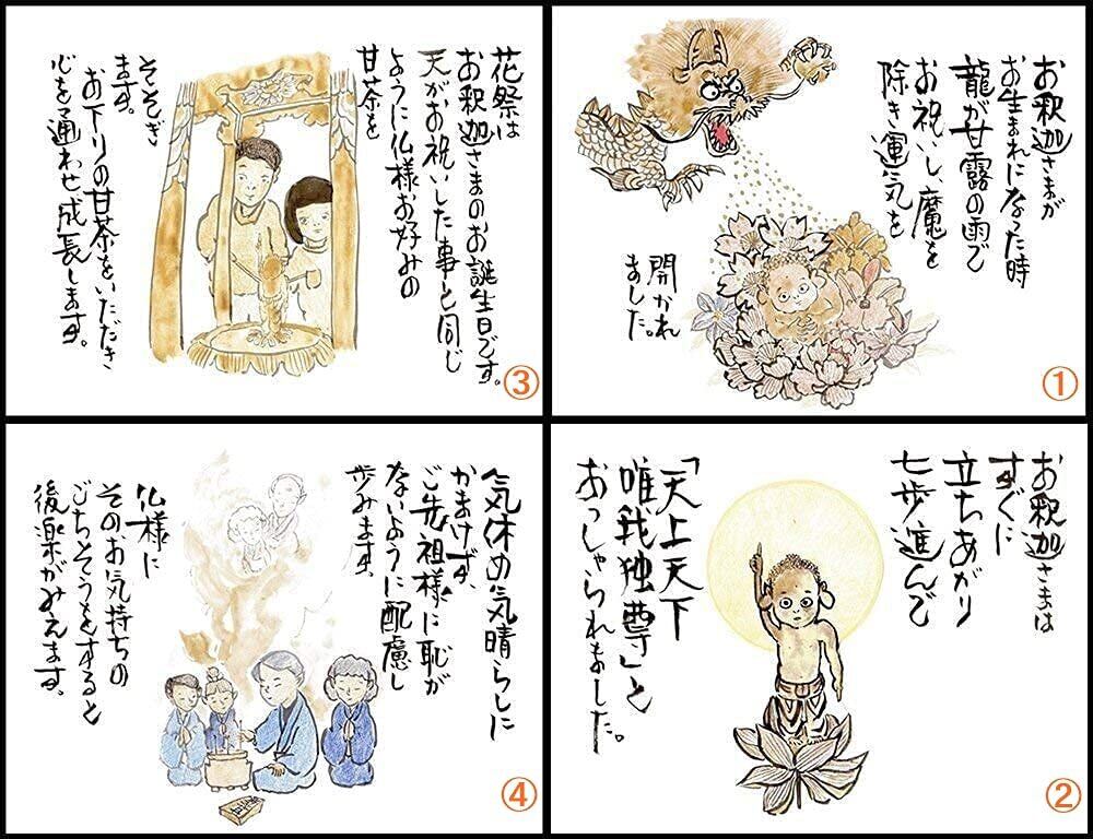甘茶は甘露に例えられお釈迦様に注がれます。仏様のお好物でお浄めになり、仏様のお好みで喜ばれます。 嗜好品のお香ではなく、献上品のお線香は先に仏様に美しい姿で好物を供えてからお願いし、そのお下がりを頂くのが神仏の定説です。 自分の我そのままから仏様に成られたご先祖様が戻られるお盆などの振る舞いに、美しく化粧をして(神楽のように好まれるもてなしの舞を舞う)、お盆という行事に乗せ仏様にご馳走して差し上げると仏様のご馳走願いを叶うといわれ故人に、又ご家族に仏様のご加護が得られ世の平和がもたらされるといわれます。