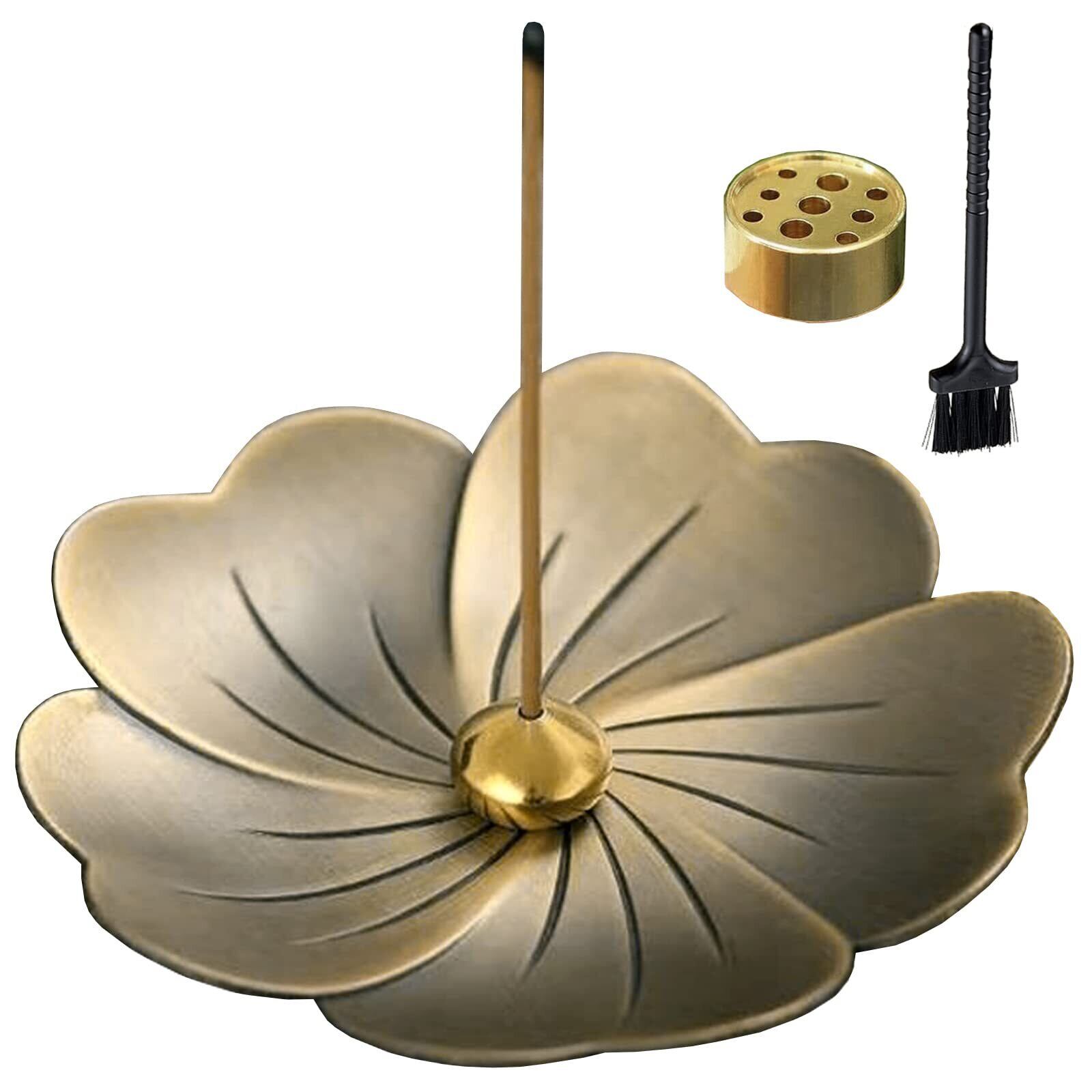 【お手入れが簡単】:合金銅めっき製でお手入れが簡単です。陶器より灰も払いやすい。桜皿のサイズは9.7cm×9.7cm、お香が倒れにくいだけでなく、灰も散らばりにくいです。また、掃除用のブラシが付属されていて、お香立てをすばやく掃除できます、とても便利です。水洗いもできます。