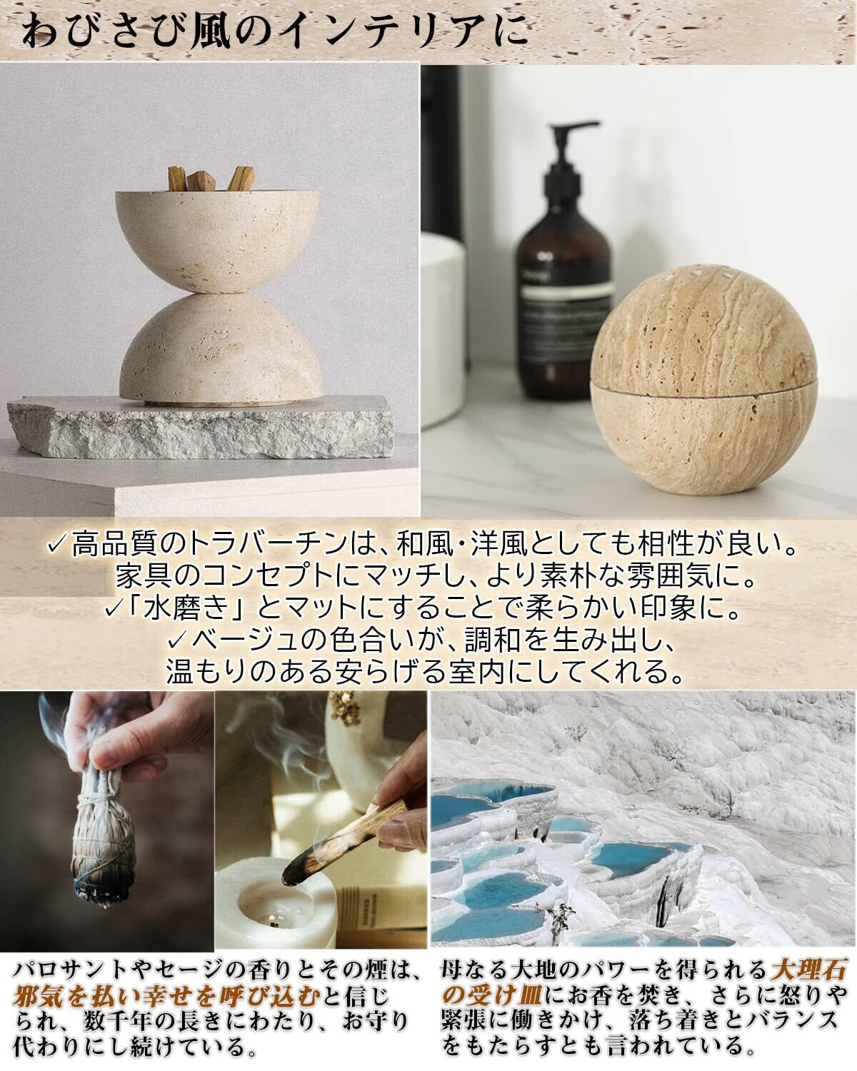 【わびさび風のインテリアに】NGEお香立ては、バウハウスデザインのように無駄をそぎ落とした洗練さをもち、心の暖かさと安心感を放つ、どこか哲学的なお香置きです。高品質の大理石の自然素材は、和風・洋風としても相性が良く、素朴な雰囲気が出せる。「水磨き」、マットにすることで柔らかい印象を与えることができる。トラバーチン特有の空隙を穴埋めせず、満ち足りないながらも、それゆえの儚さと美しさを併せ持っている。控えめなボールパターンは洗練された香り空間を作る。波模様が木目のようにも見え、モダンな落ち着いた空間を引き出す。ベージュの色合いが、平和と調和を生み出し、温もりのある安らげる室内にしてくれる。