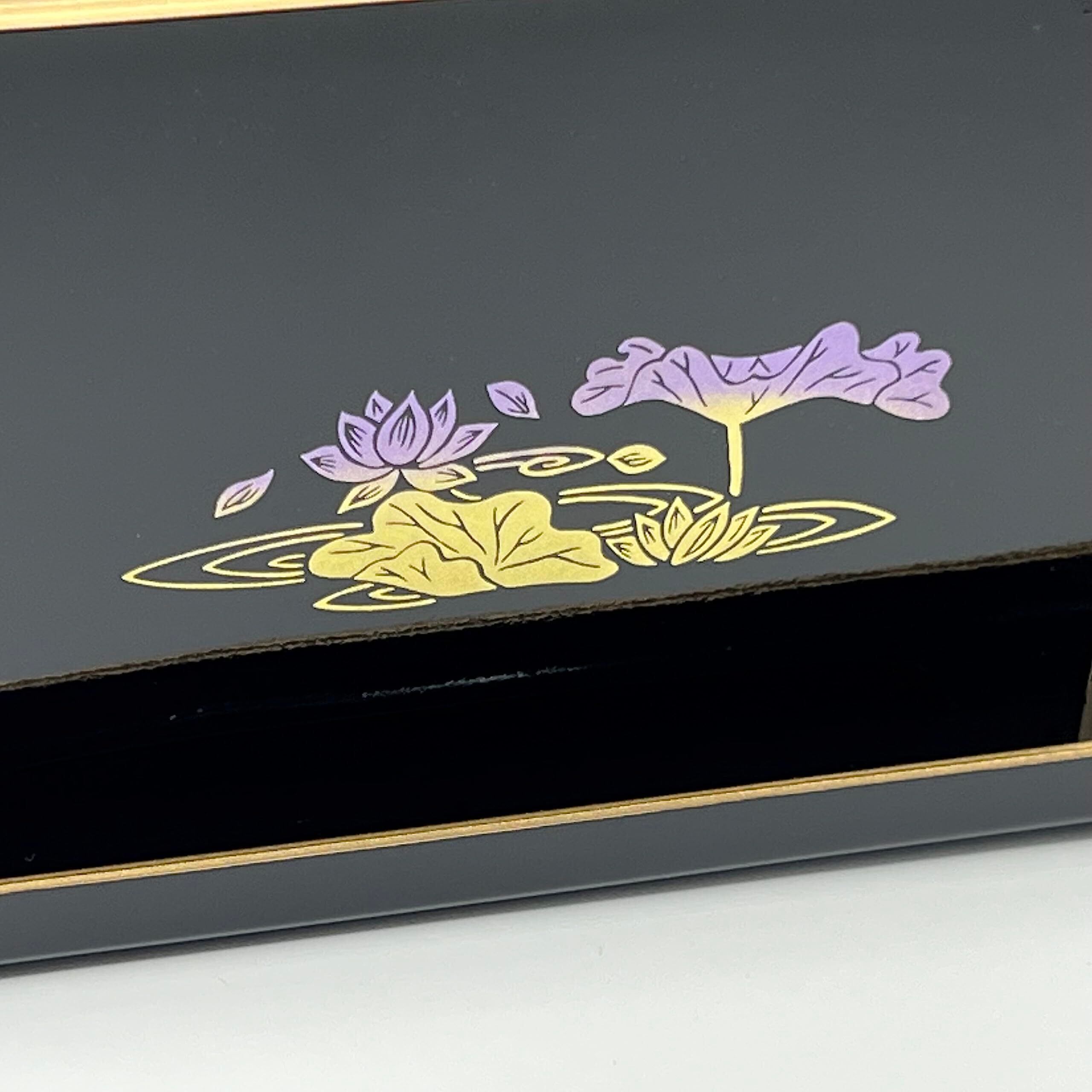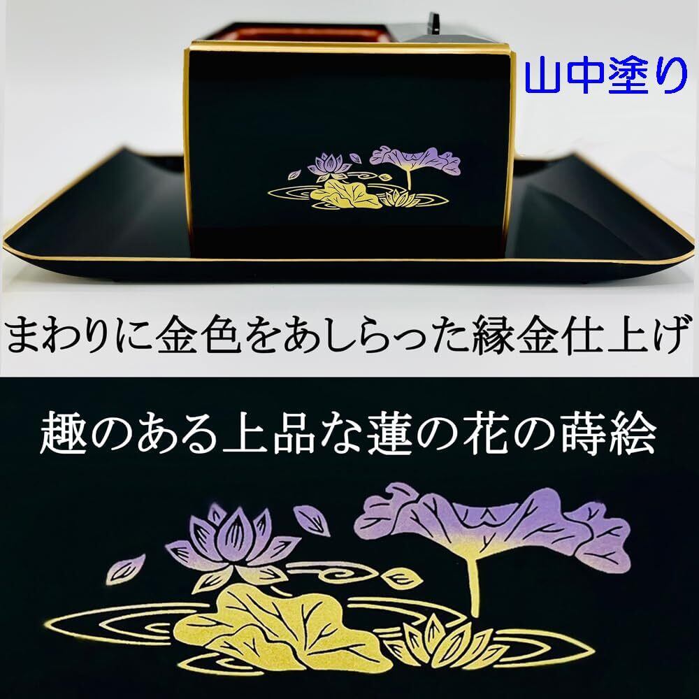 上品な蒔絵をあしらった山中塗りの5寸香炉(黒縁金)、焼香盆(黒縁金)付き