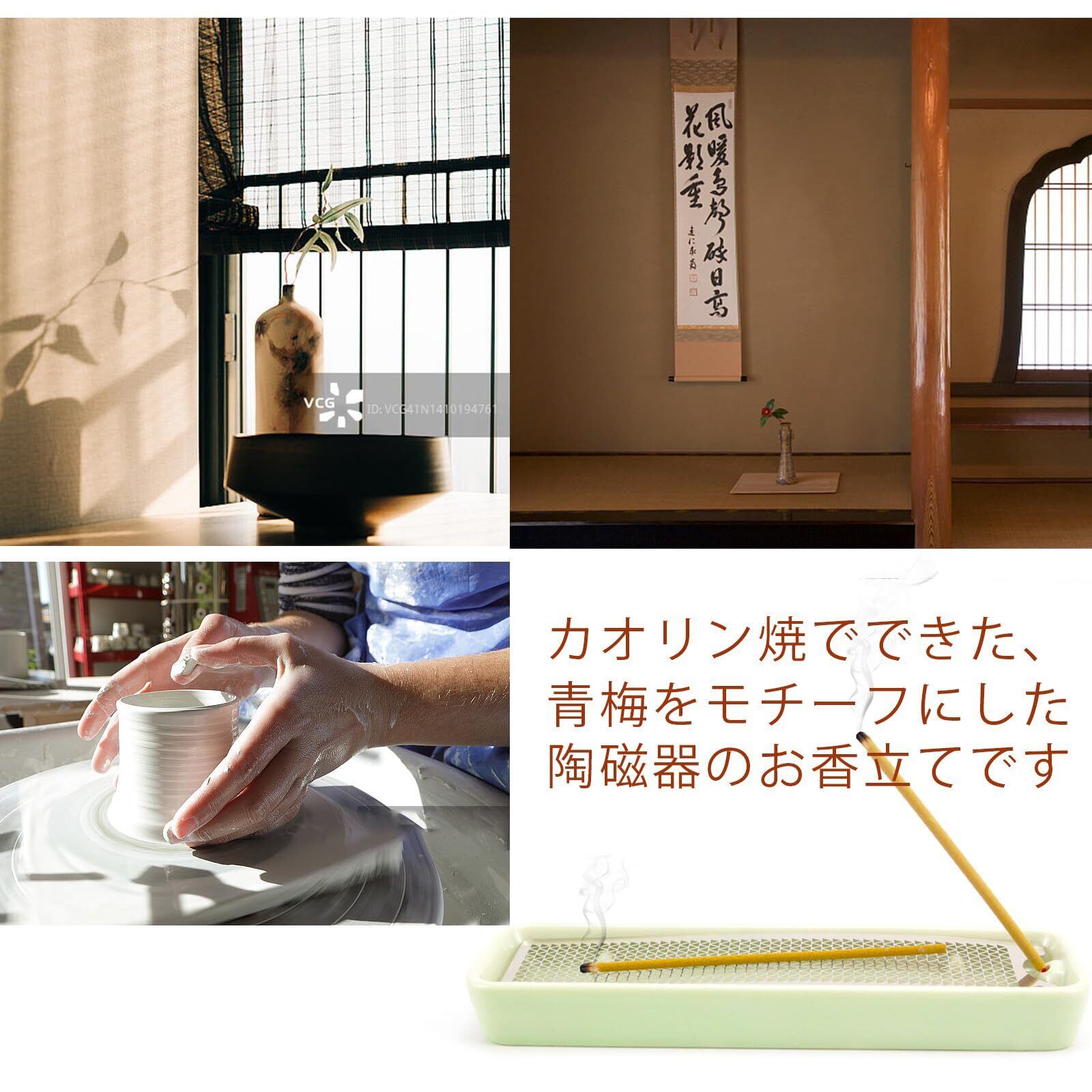 カオリン焼でできた、 青梅をモチーフにした陶磁器のお香立てです、お香やお線香を燃やすために最適であり、お香たてや線香立てとして使用することもできます。おしゃれなデザインで、インテリアとしても素敵なアクセントになります。この陶磁器の線香皿は、お香立て横置きタイプで瞑想や禅修、またマインドフルネスなど、癒しのひとときをお過ごしいただけます。