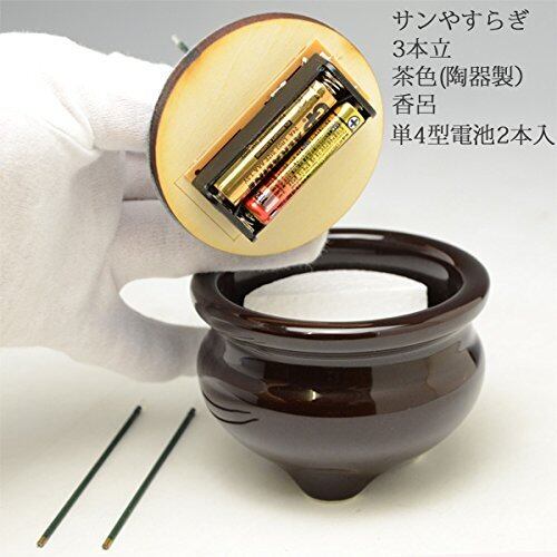 ハセガワ仏壇 先端が赤く光る 電子線香 サンやすらぎ 3本立(3寸) 陶器製香炉付 [茶色] 電池付き 9.5×15.6cm