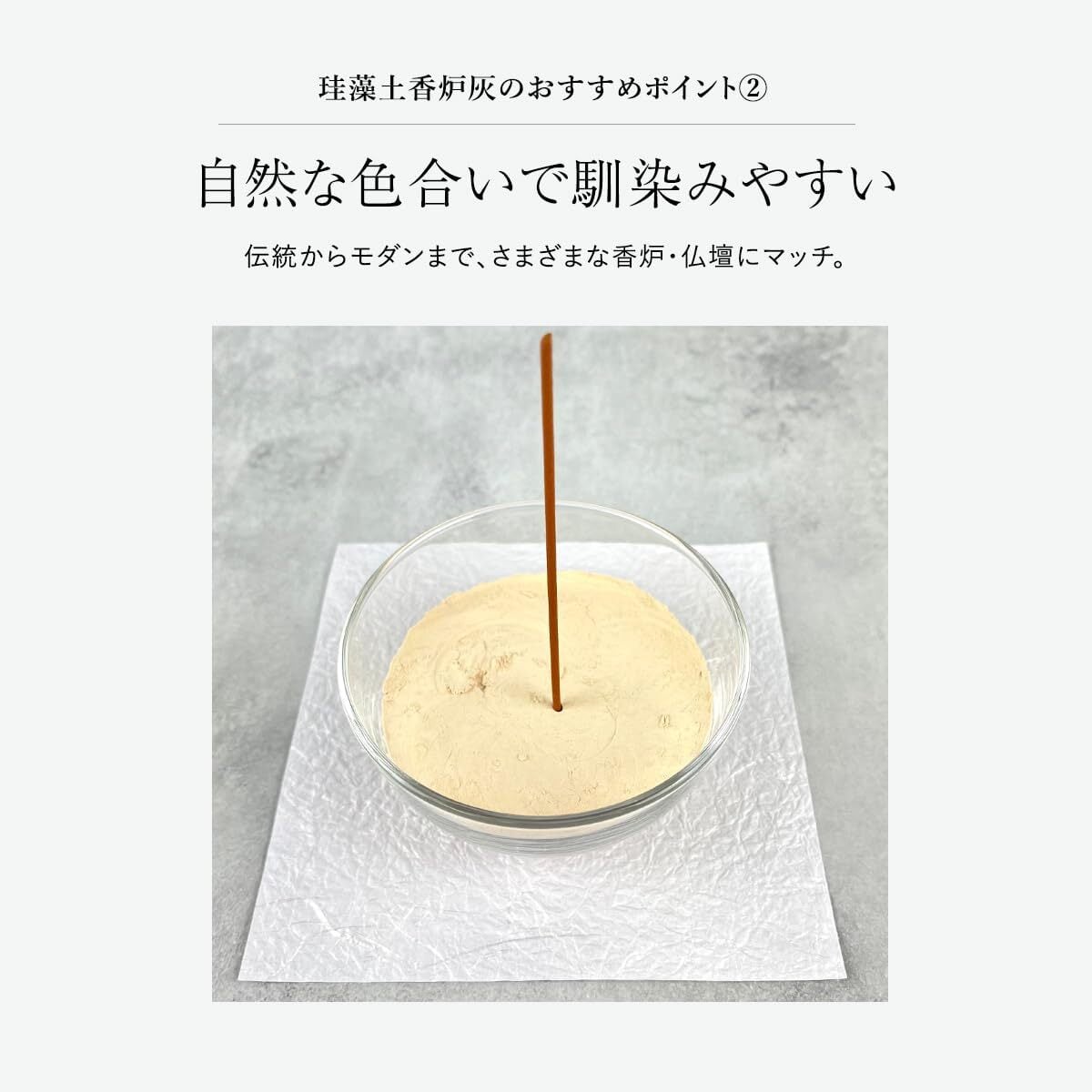 国産珪藻土を使用した香炉灰。 線香が立ちやすく、保温性も高いので燃え残りが出にくいのが特徴です。 適度な粒子サイズで扱いやすく、お手軽にお使い頂けます。 薄茶色の香炉灰はインテリアとしても美しく演出してくれます。