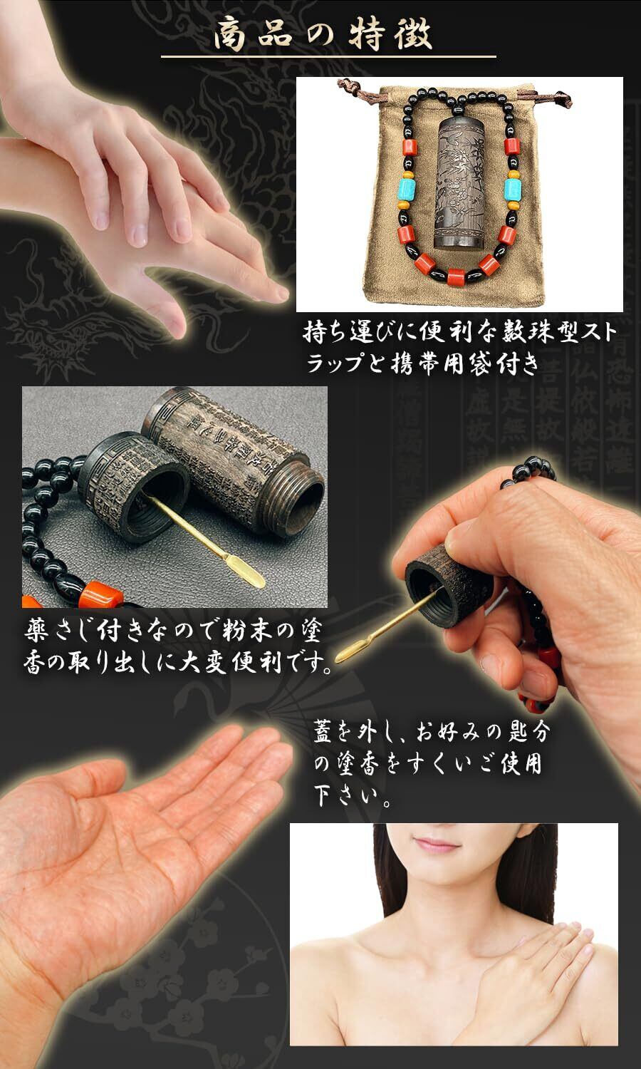【特徴・使い方】持ち運びに便利な数珠型ストラップと携帯袋付き。薬さじ付きなので粉末の塗香の取り出しに大変便利です。蓋を外し、お好みの匙分の塗香をすくいご使用下さい。