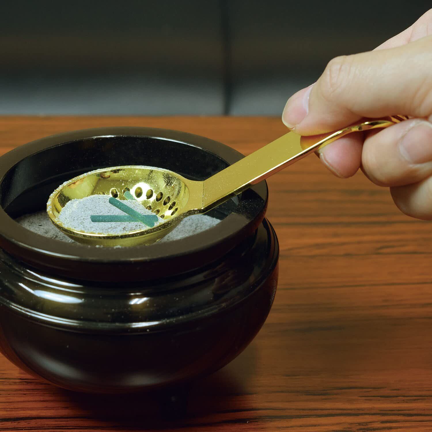 【使いやすさにこだわりあり】小さな香炉にもすっと入るよう持ち手の角度にこだわったスプーン形状。ふるい部分は丸形の適度な深さですくいやすく壺状のカーブにもフィットし隅々までお掃除ができます。
