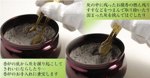 お線香の燃え残りや、焦げたすすなどをつまんで取り除いたり、湿気で固まった灰を挟んでほぐしたり、香炉の底から灰を掘り起こしてきれいにならしたり…香炉のお手入れに重宝します。