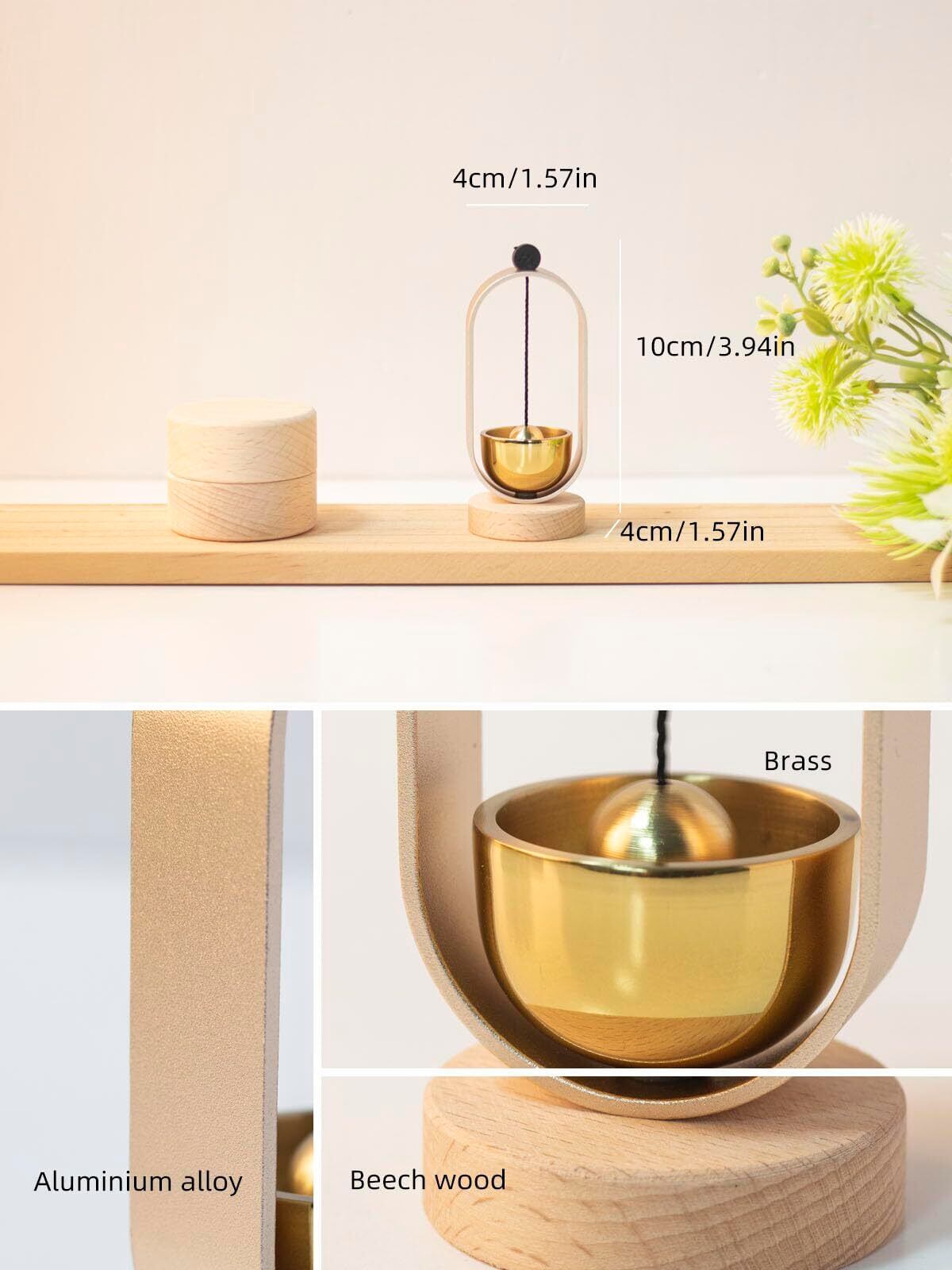 【中~おりんのサイズ&材質】高さ10cm×直径4cm おりん(真鍮)*1 りん棒(アルミニウム合金)*1 台座(天然木)*1※全て手作業で作られており、天然木を使用しているため、木目等仕上がりが個々で違います。