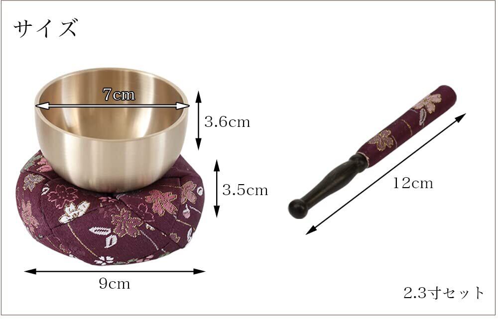 【サイズ】2.3寸◆おりん:口径7cm×高さ3.6cm りん棒:12cm りん布団:直径9cm×高さ3.5cm