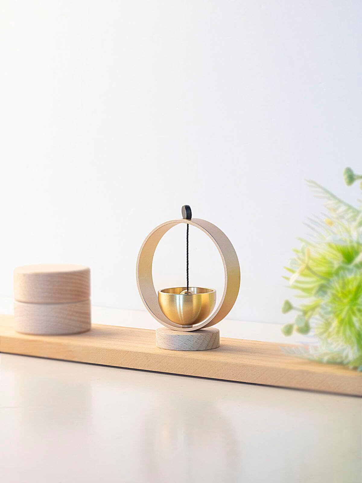 【デザインはシンプルかつモダンで】木の台座に金属円のフレーム,最小限のおりん。そっと金属球を垂らすだけで,シンプルさを極限まで追求しながら機能も失っていない。サイズはとても小さくかさばらないので、仏壇など省スペースのミニ仏壇などにマッチする可愛い大きさです。