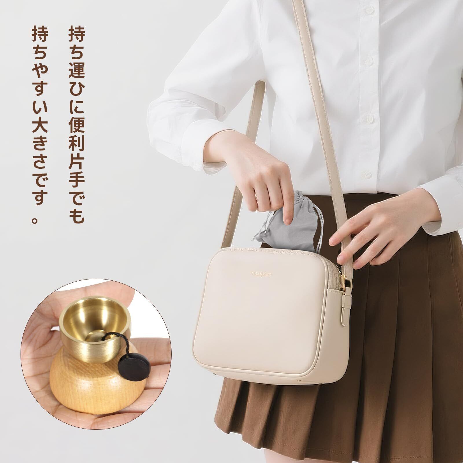 【持ち運びに便利なおりん 仏具】外出時や法要にも便利な巾着袋付き。軽量なおりんは、いつでもどこでもお使いいただけます。
