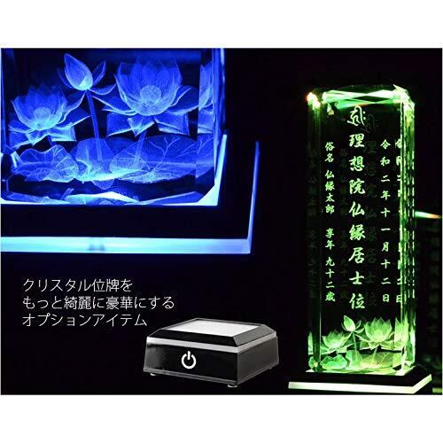 接地面(幅5cm×奥5cm)が同じだから余計な光の漏れがなく、クリスタル内部を照らします。3Dクリスタル位牌「ベセル(舟形)」にも使用可能。ゆっくりと色が変化するレインボーパターン発光をずっと見ていたくなる幻想的で美しい煌めきです。