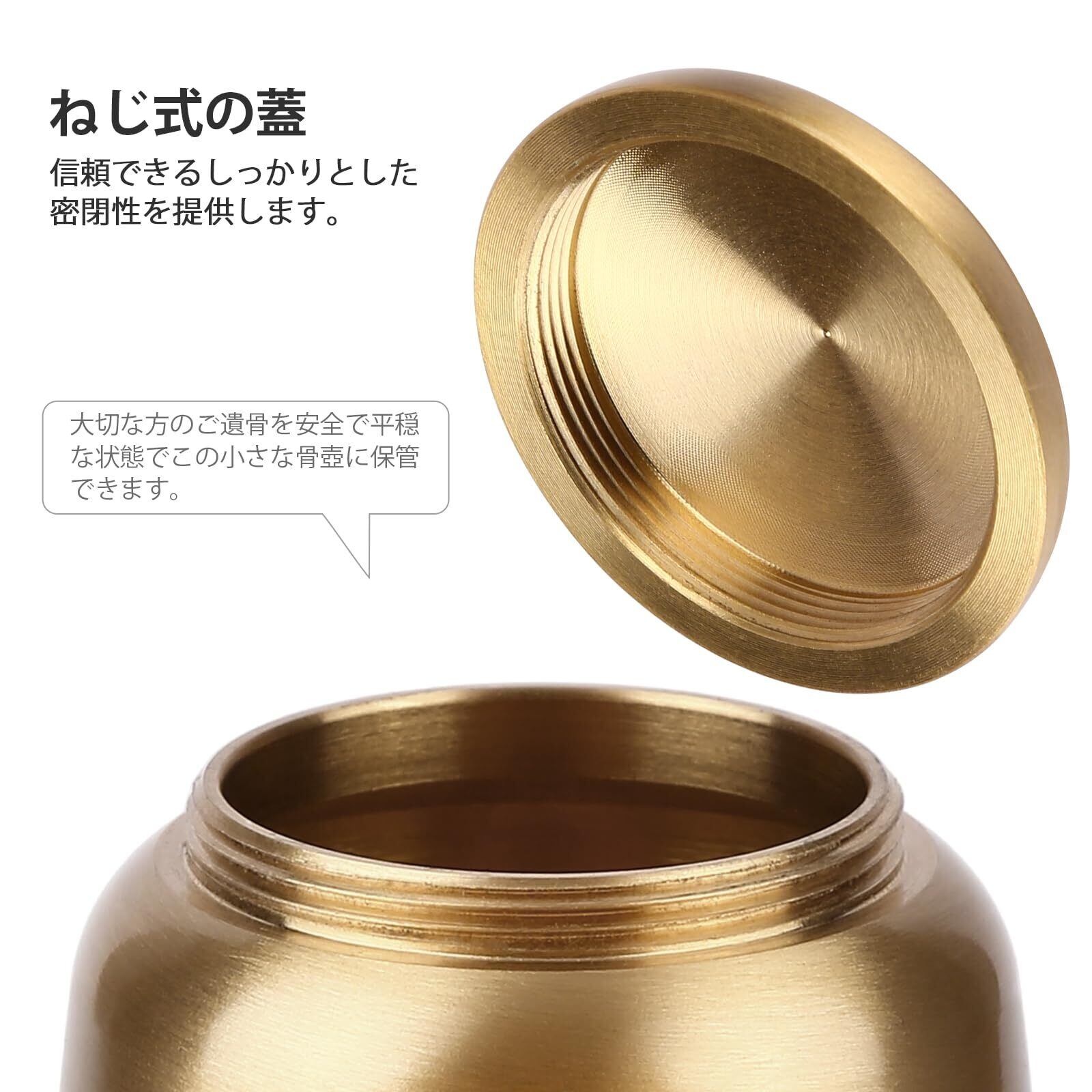 【頑丈で安心】: 真鍮製のため耐久性に優れ、湿気や衝撃にも強い構造です。ネジ式の蓋で密閉性が高く、たとえ落下しても破損しません。遺灰を丁寧に保護し、長く大切に保管できます。