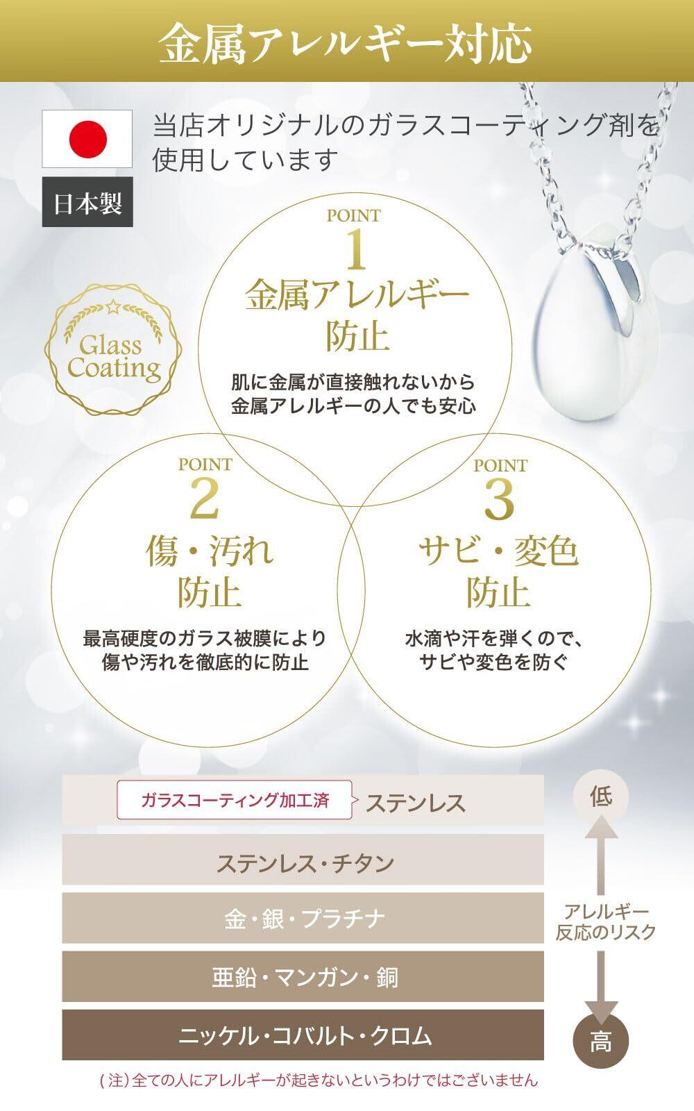 ペンダントトップ・ペンダントチェーン共に、サビや汚れに強く、アレルギーを起こしにくいと言われるステンレスを採用。