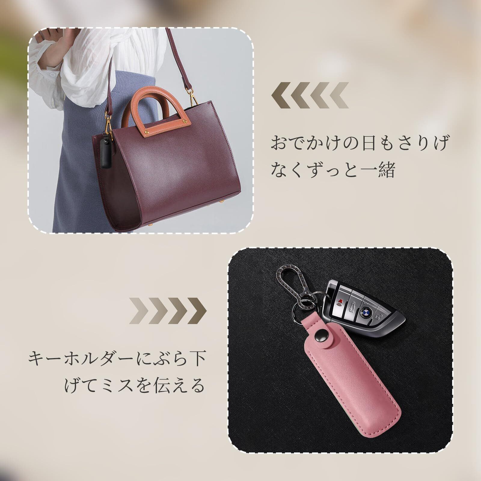 【おでかけの日もさりげなくずっと一緒】キーホルダー型はバッグに取り付けてビジネスにも普段使いにも使えるので、いつでもどこでも気兼ねなく一緒に出かけられる。
