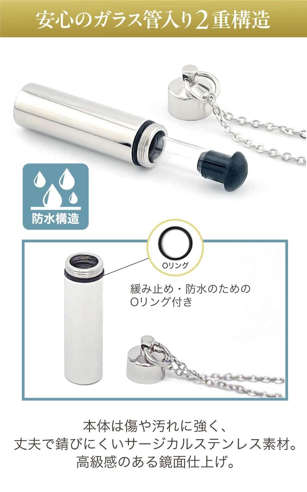 【安心のガラス管入り二重構造】本体の中に ガラス管 が入った「二重構造」。 さらに、ステンレスカプセル は、緩み止め・ 防水 のための Oリング付き なので、 ご遺骨 ・ ご遺灰 を大切に保管する事ができます。