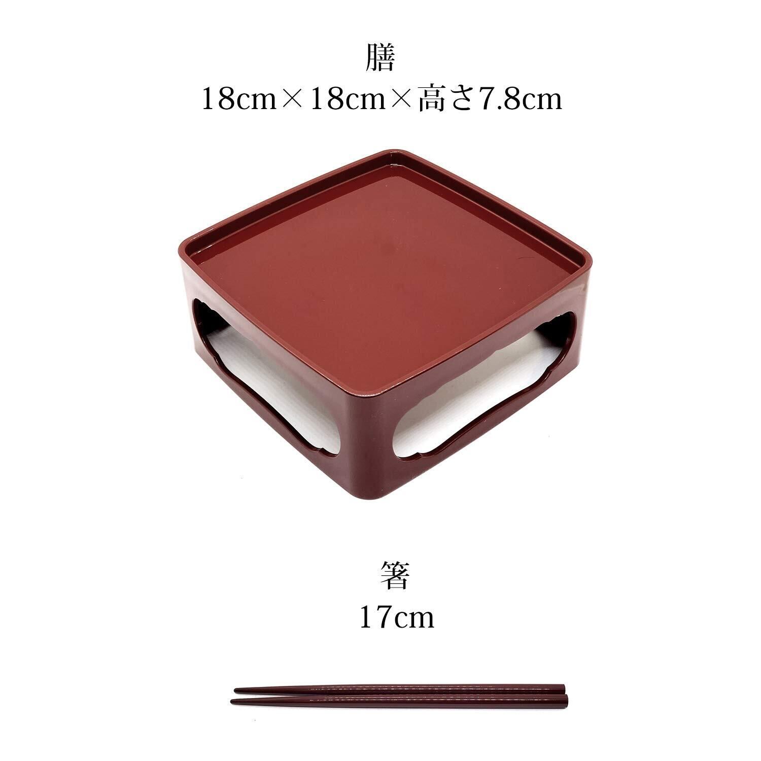 【寸法】6.0寸 ◆膳:幅18cm×奥行18cm×高さ7.8cm ◆飯:直径7.0cm×高さ4.8cm ◆汁:直径6.5cm×高さ3.3cm ◆平:直径6.8cm×高さ3.0cm ◆壺:直径5.3cm×高さ3.5cm ◆高坏:直径6.0cm×高さ3.5cm ◆箸:長さ17cm
