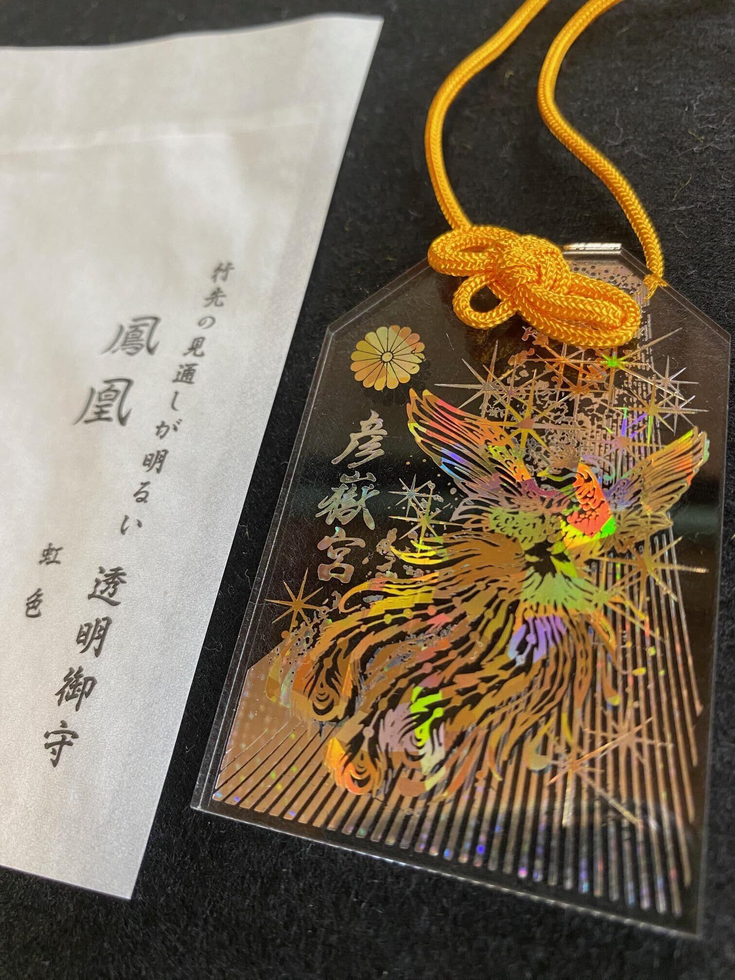 彦嶽宮の神域を守る鳳凰をデザインした透明御守です。 光に当てると、美しく七色に輝きます。 鳳凰が道しるべとなり、様々な悩みから抜け出せるようにお導き致します。 【サイズ】 縦67mm×横45mm 【神社・彦嶽宮で祈願済み】 熊本県山鹿市に鎮座する1900年以上の歴史を持つ神社です。 御守はご祈願済みとなります。 【取り扱い上のご注意】 御守りの表面は箔押しとなります。 硬い素材等で強くこする等されると箔が剥がれる可能性がございますので、ご注意ください。