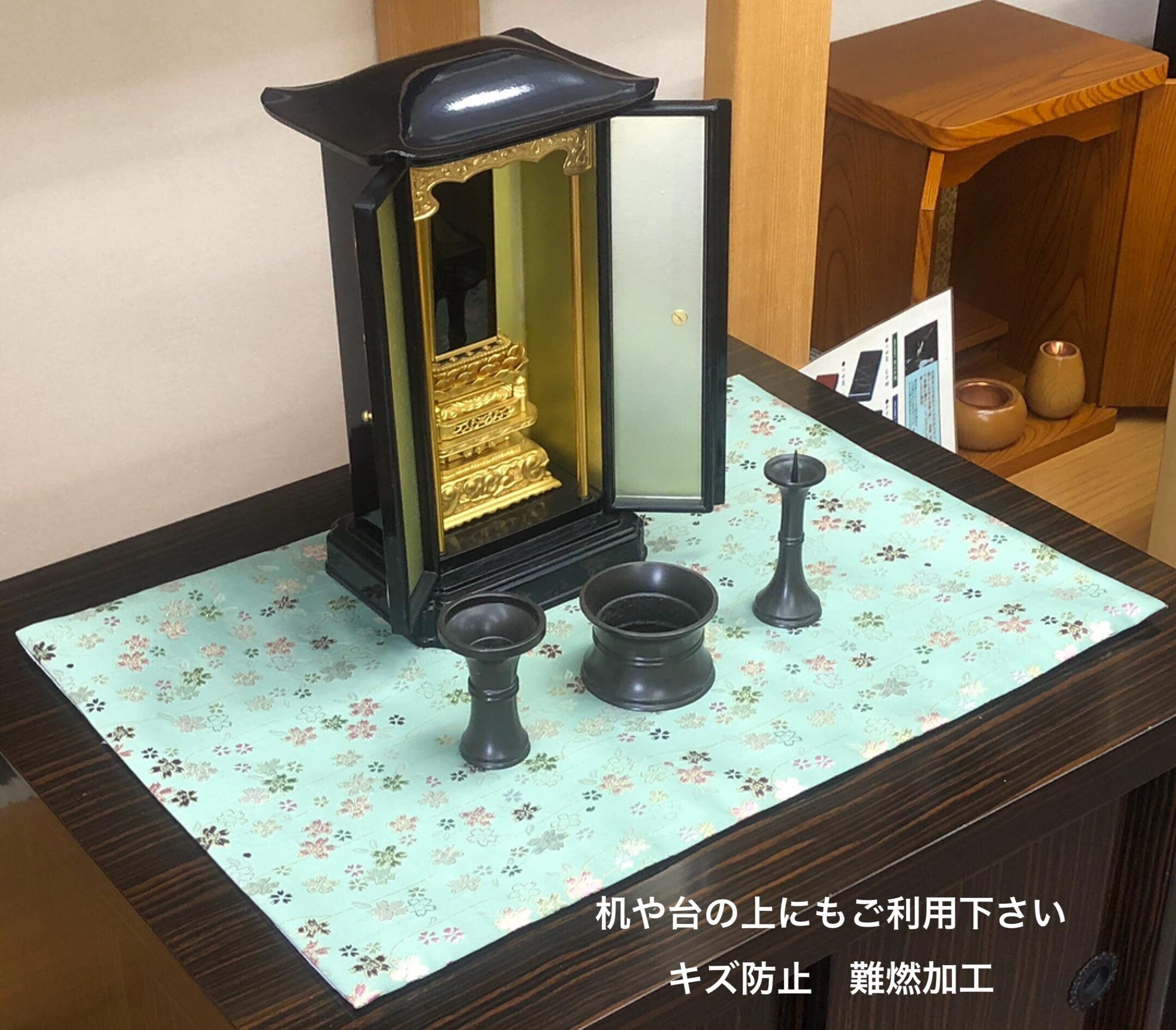 経机掛 さくら柄 経机マット 経机敷 防炎加工 経机敷物 京仏壇いせむら 秀蓮 経机 仏壇机 仏壇マット 防炎防火 (22号, 緑)