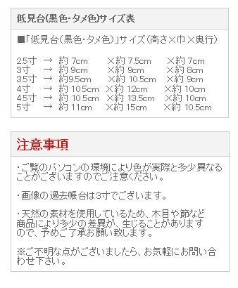 「過去帳台 低見台(タメ色・黒色)」のサイズ(縦×横×厚み) 2.5寸 → 約 7cm×約 7.5cm×約 7cm、3寸 → 約9cm×約9cm×約8cm、3.5寸 → 約9.5cm×約10.5cm×約 9cm、4寸 → 約 10.5cm×約 12cm×約 10cm、4.5寸 → 約 11cm×約 13.5cm×約 10.5cm