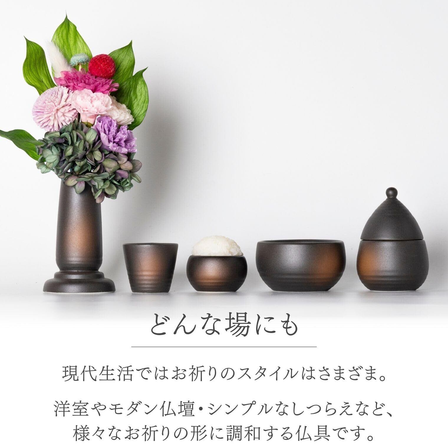 【純国産】日本製。こだわりの「純国産仏具」です。シックで温かみのある備前焼調の陶器は、さらっとした落ち着いた質感。家具調のモダンな仏壇や、洋室やマンションにも馴染みます。焼き物の一大産地、愛知県瀬戸市で職人がひとつひとつ丁寧に作成します。