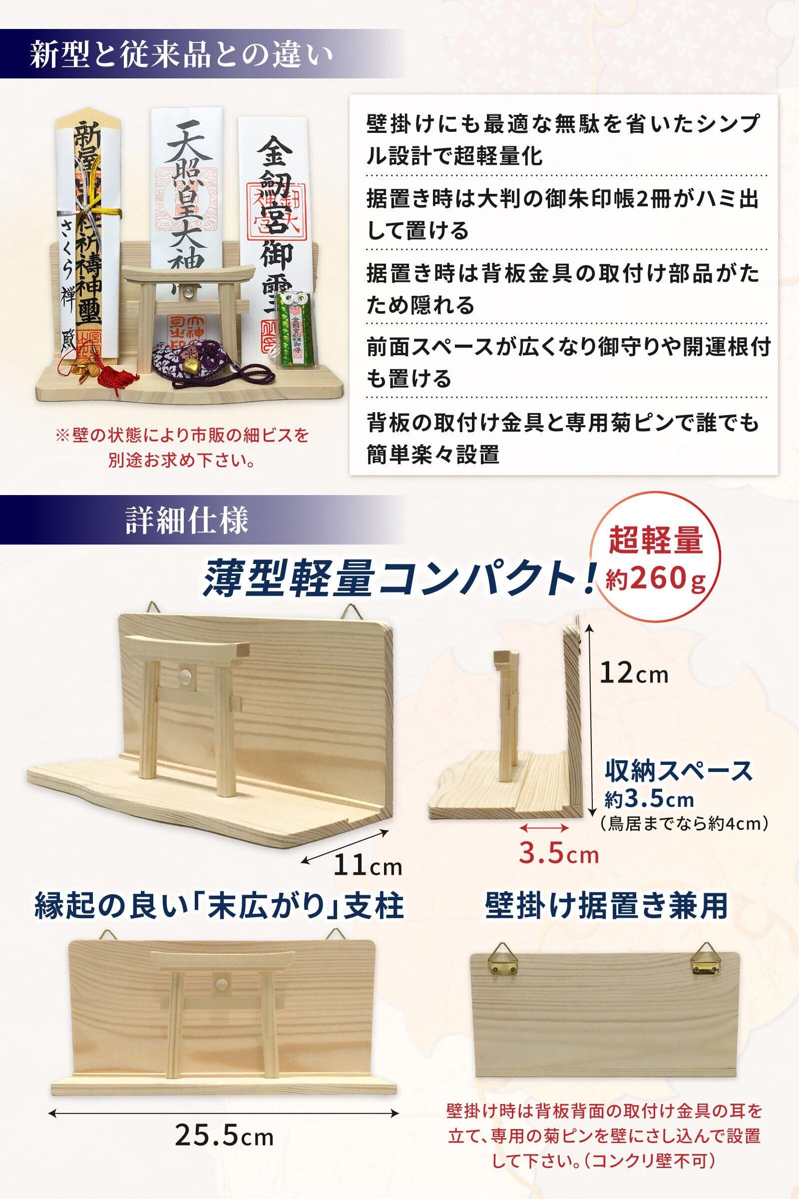 【神棚の仕様】素材:天然白松 サイズ(約)縦12㎝×横25.5㎝×奥行11cm 重量:(約)260g お届け時に箱から出してすぐにお祀り頂ける完成品。壁面設置の場合は本品裏の吊下げ器具の耳を立てて頂き、付属の菊ピン2本を刺すだけでどなたでも簡単設置できます。(菊ピン設置はコンクリ壁面不可)※説明書の付属はありません ※神棚写真にイメージでお祀りの御札や御朱印帳などの付属はございません。その他はセールス画像をご覧ください。