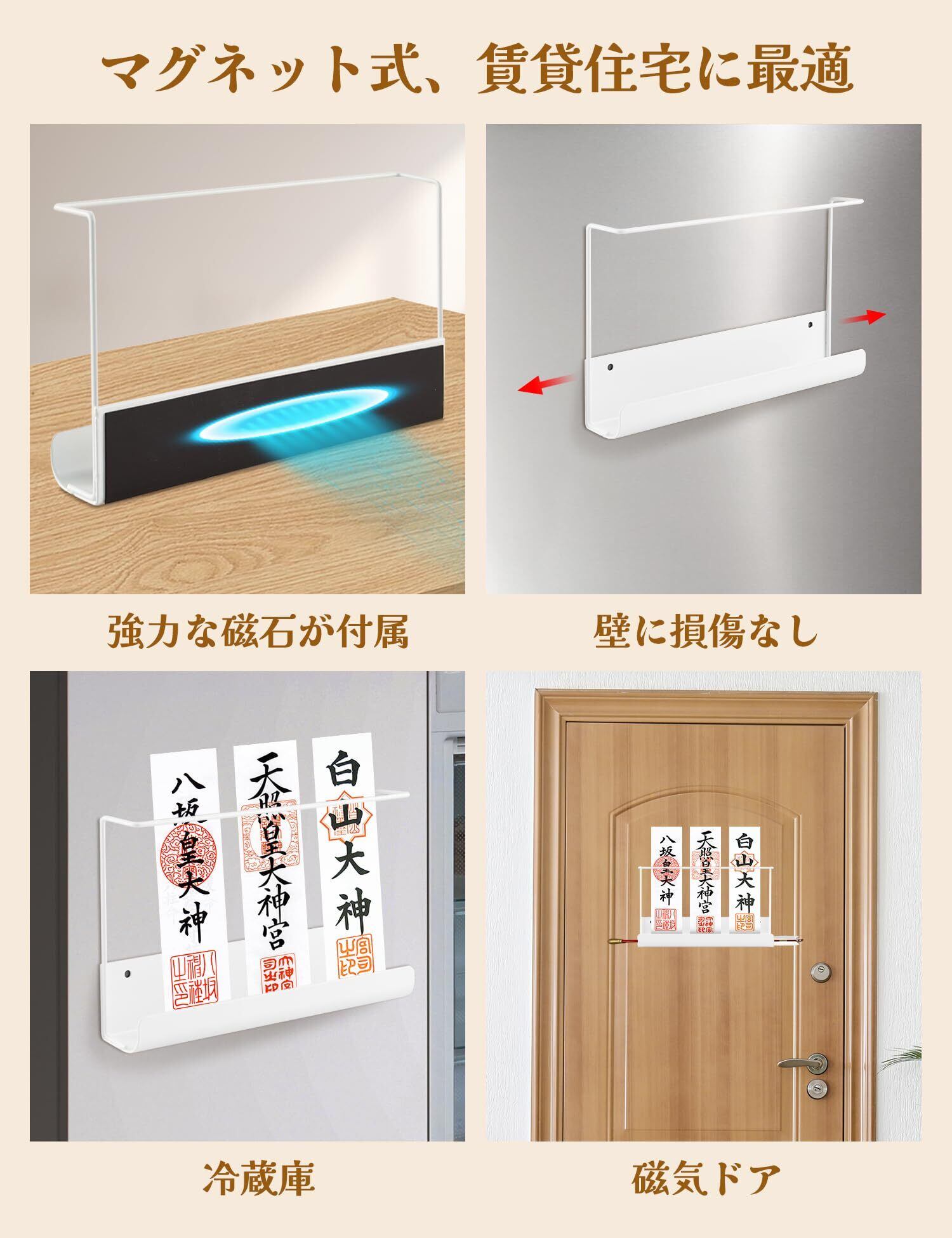 【商品内容】 マグネットお札立て*1:25.5CM×14CM×10CM、 雲板*1:12M×12CM×0.3CM(貼ってはがせる粘着剤×10、両面テープ×10) 注:この製品には御札は含まれていません。お手持ちの御札のサイズを確認の上、ご購入ください