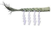 しめ縄は、そこが神聖な場所であることを示すために張られる縄のことです。内と外を区別し、神棚を不浄から隔てる役割を持つ神祭具です。しめ縄には紙垂または四手と呼ばれる紙片を挟み込みます。稲妻の形である紙垂は豊作を表し、邪なものを祓い、聖域を示しています。新たな年を迎える準備として、しめ縄は年末に交換される慣わしがあります。