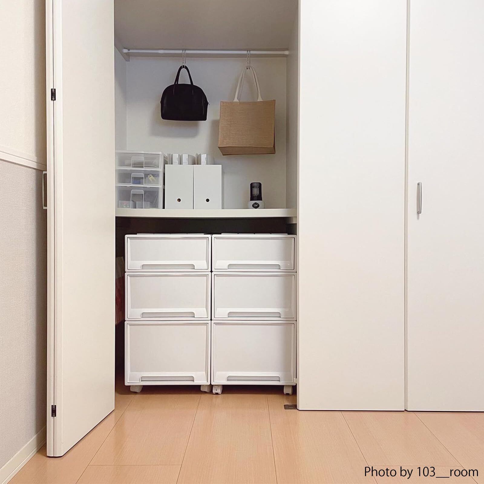 クローゼットの収納に最適な収納ケースです。積み重ねてもたわみにくい丈夫な前枠が付いています。ボディが透けないタイプなので隠す収納にぴったりです。