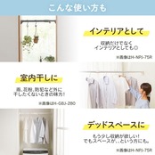 【使い方いろいろ】[ハンガーラックに]壁と壁の間に突っ張るだけ。洋服も小物まとめてコンパクト収納。[インテリアに]観葉植物を吊るしておしゃれに。[カゴと一緒に]伸縮棒を2本段違いに設置してカゴを置けば、斜めになって取り出しやすいアイデア光る収納に。