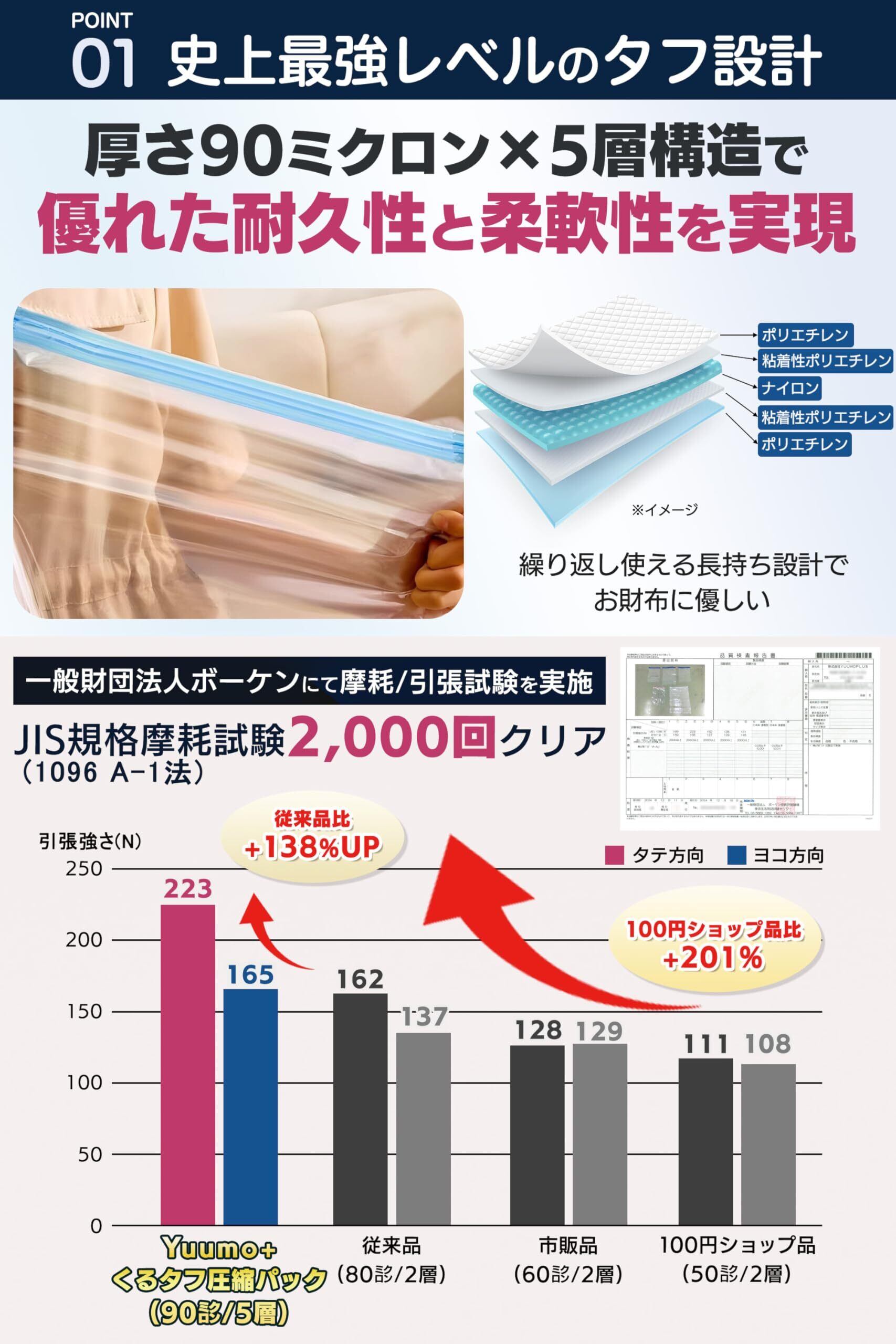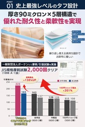 【史上最強レベルのタフ設計*】厚さ90ミクロン×5層構造で優れた耐久性と柔軟性を実現。摩耗試験(JIS規格1096A-1法)2,000回クリア、引張強さは従来品(80ミクロン)比+138%アップ、100円ショップ品(50ミクロン)比+201%アップ(一般財団法人ボーケンにて各試験実施、*当社従来品比)。繰り返し使える長持ち設計でお財布に優しい。