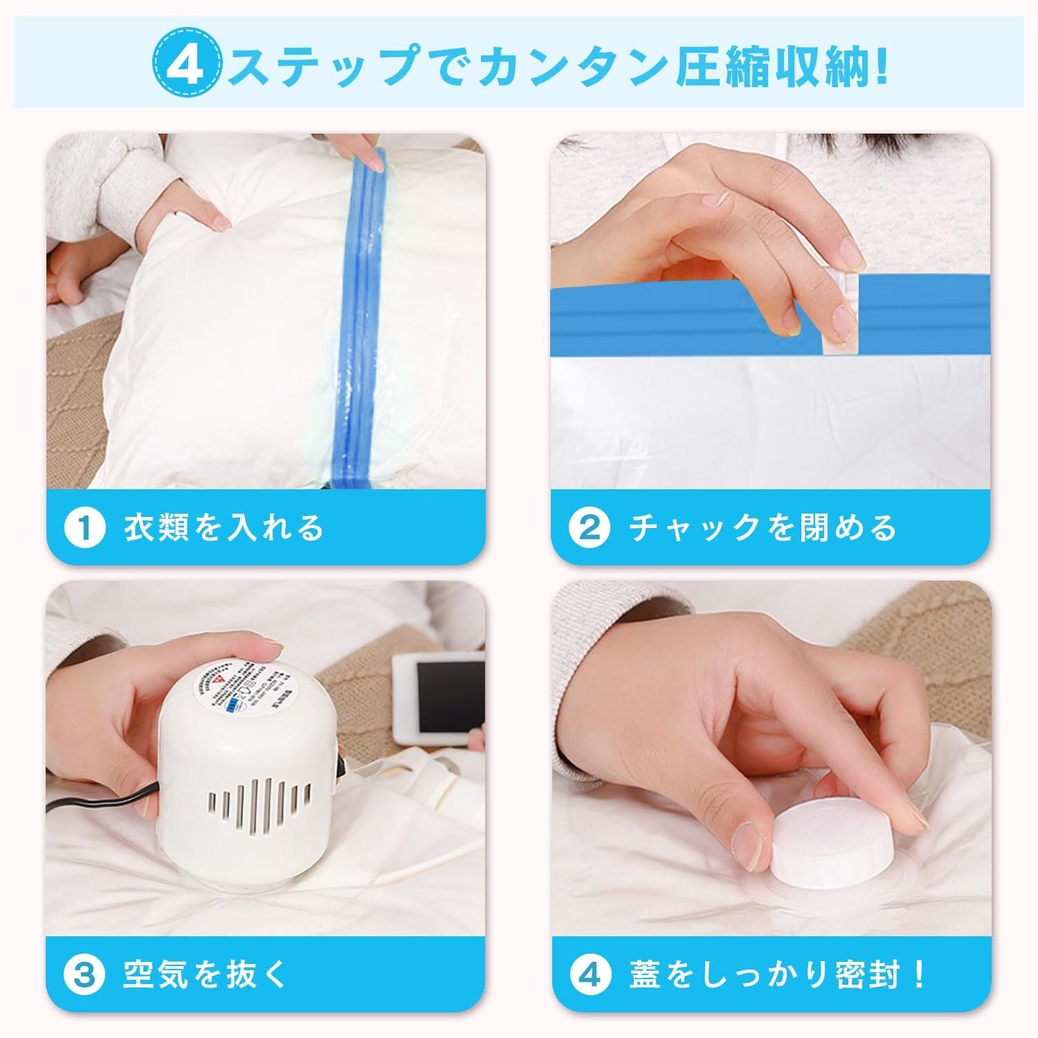 布団圧縮袋【電動ポンプ付き】【7枚セット・1*S/ 2*M/ 2*L/ 2*XL】 掃除機不要 旅行用 衣類 毛布 洋服 ふとん 特大サイズ 省スペース 高密封性 防湿 防塵 防臭 防カビ ダニ対策 収納/引越し/衣替え/旅行/出張ふとん圧縮袋 1*S(40×60cm)/2*M(60×80cm)/2*L(80×100cm)/2*XL(100×120cm)