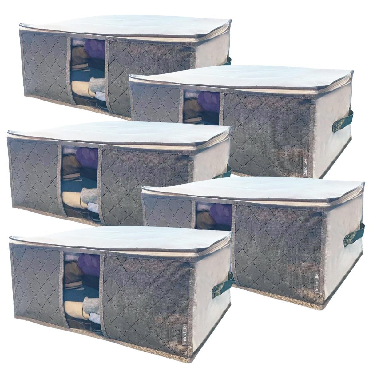 イニコライフ 衣類収納ケース 5枚組 通気性の良い 厚手不織布製 洋服 収納ボックス 衣装ケース 前面活性炭シート入り 収納袋 クローゼット 押し入れ 持ち手 クリア窓付き 使わない時は小さく畳める(中芯無し)