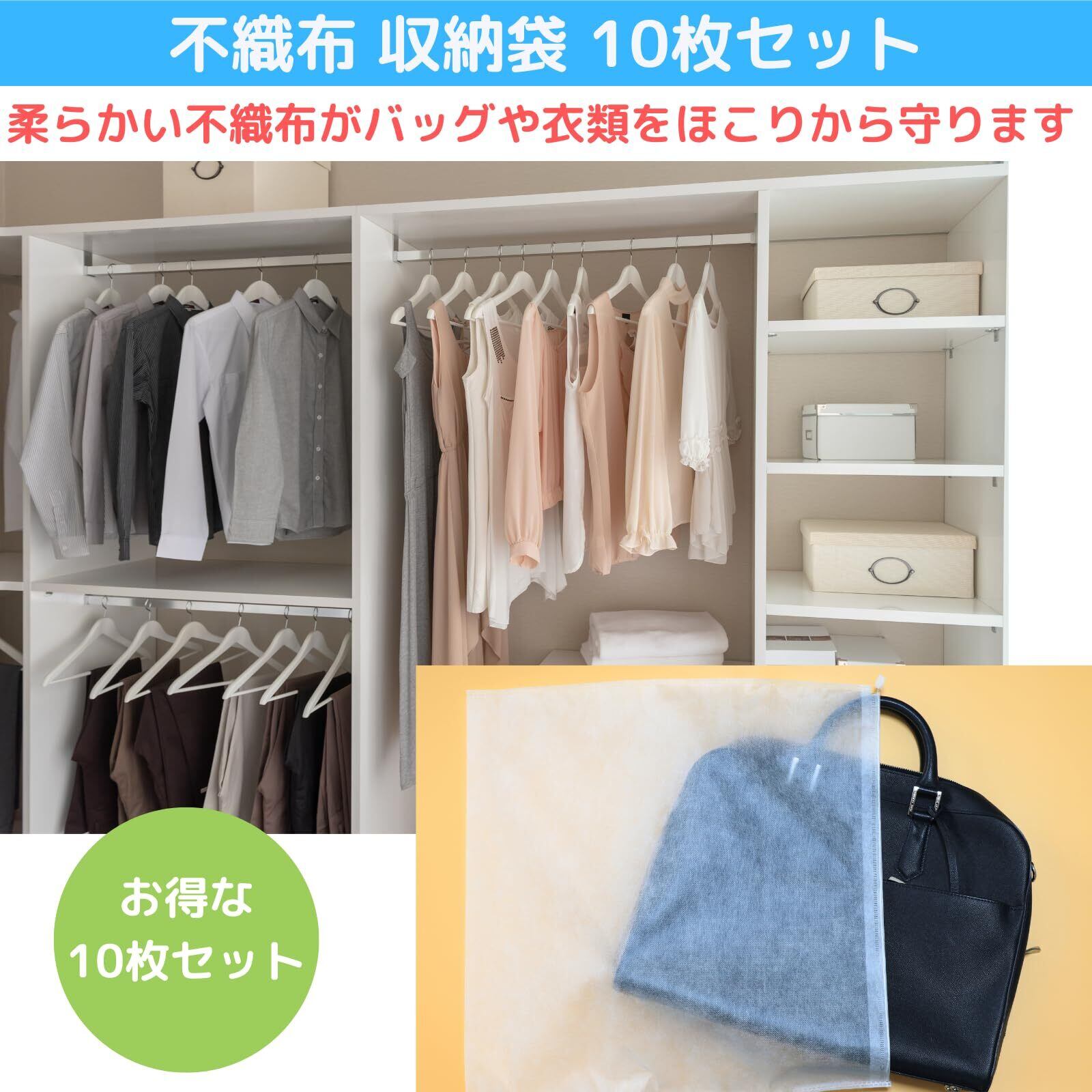 【上質な不織布】通気性が良く、しなやかな風合いの薄手の不織布素材を使った収納袋です。生地はふんわりやわらかくシースルー感のある薄タイプで、スッキリ収納可能。【様々な用途】軽くて薄手の素材で中身が透けて見えるので管理しやすく、靴・バッグ保管、衣替えの際にも重宝します。旅行の際の荷物の仕分けや、小物の収納など様々な用途で使えます。【商品サイズ】 不織布収納袋 10セット サイズ:約W50×H50cm 材質:ポリプロピレン