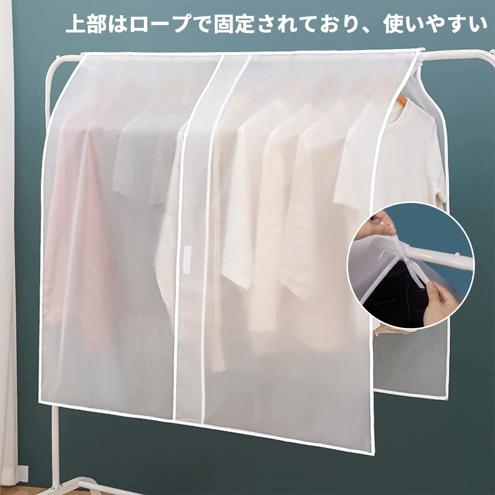【防水性・通気性が抜群】 水に強く風通しのよいPEVA材質。湿気から服を守り、カビ・ニオイ・虫を防ぎます。汚れたら水拭き可能。タバコのニオイ・生活臭・虫食いから衣類を守って長持ちさせま。左右に紐が付いているので、どんな棚やハンガーにも取り付けられます。カバーの取り付けは、両サイドの紐をつけるだけと簡単です。