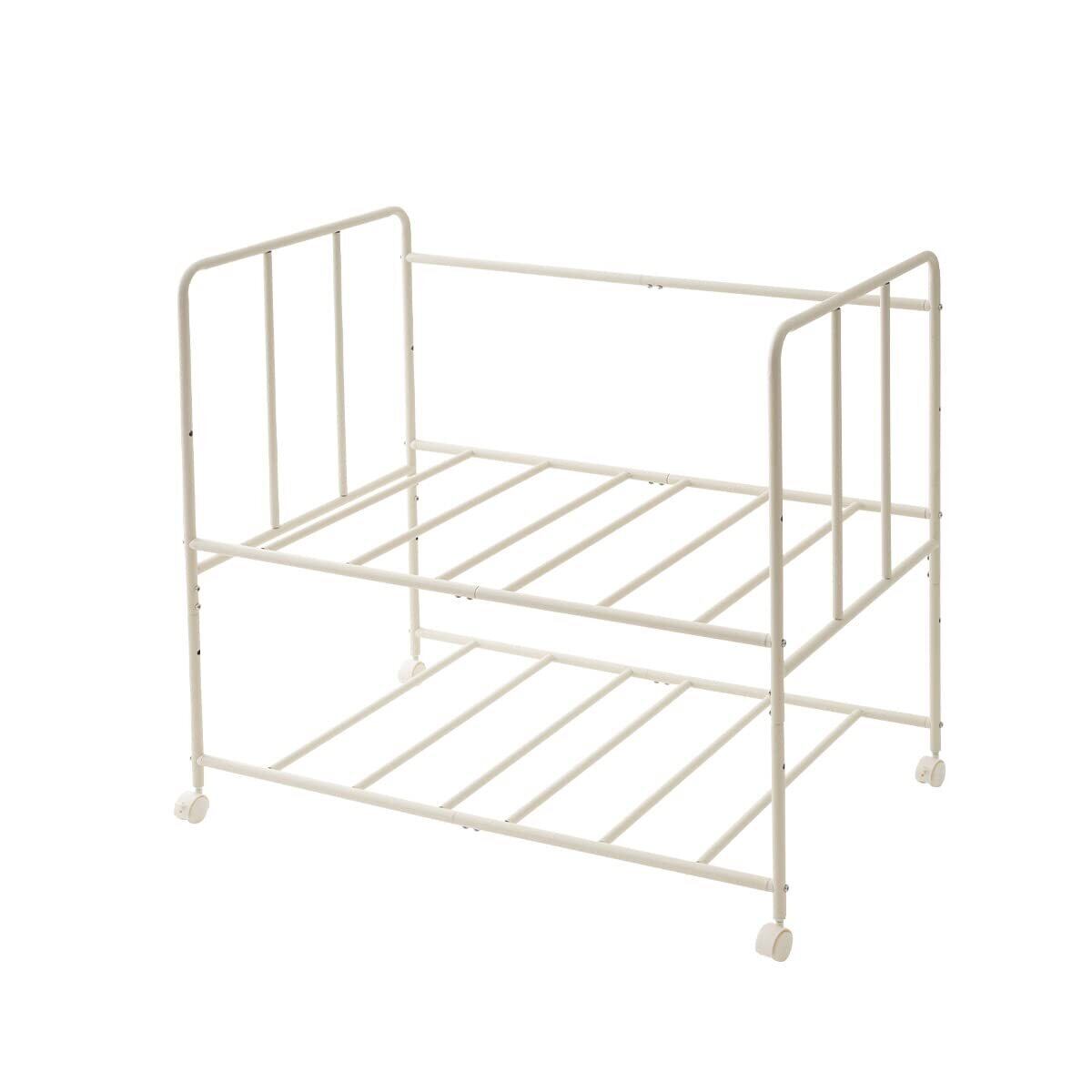 【サイズ】 約幅104×奥行60×高さ90cm 【材質】 スチール(粉体塗装) 【カラー】 ホワイト 【耐荷重】 総耐荷重:約40kg(上段:約20kg、下段:約20kg) 【仕様】 棚板高さ調節可能 【組立時間】 約30分