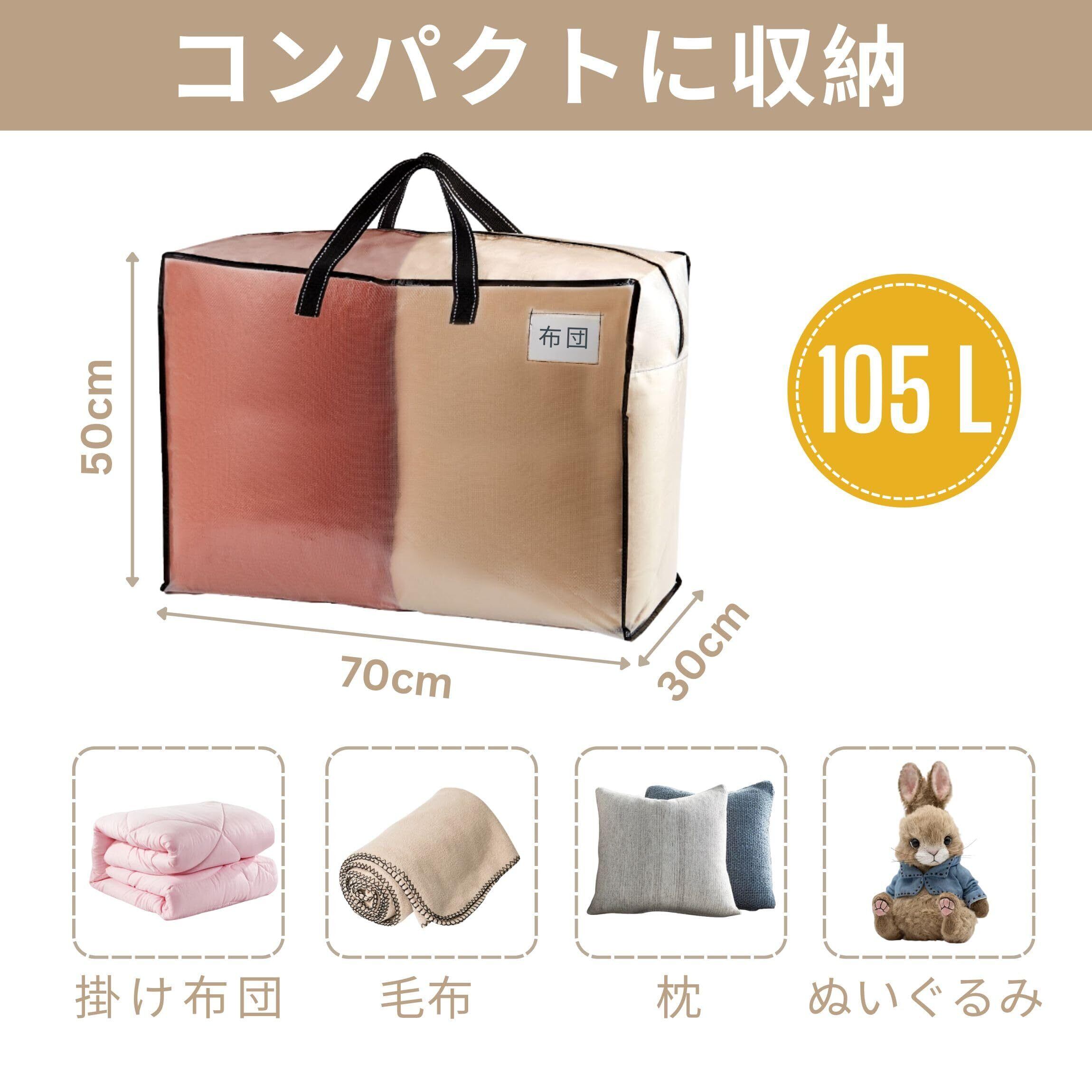 【大容量】サイズ:幅70cm × 高さ50cm × 奥行き30cm、収納容量105リットル。衣類収納、布団収納はもちろん、靴、毛布、寝具、枕、タオル、クリスマス飾り、お土産、ギフト、洗濯物、キャンプ用品など、さまざまなアイテムを収納できます。