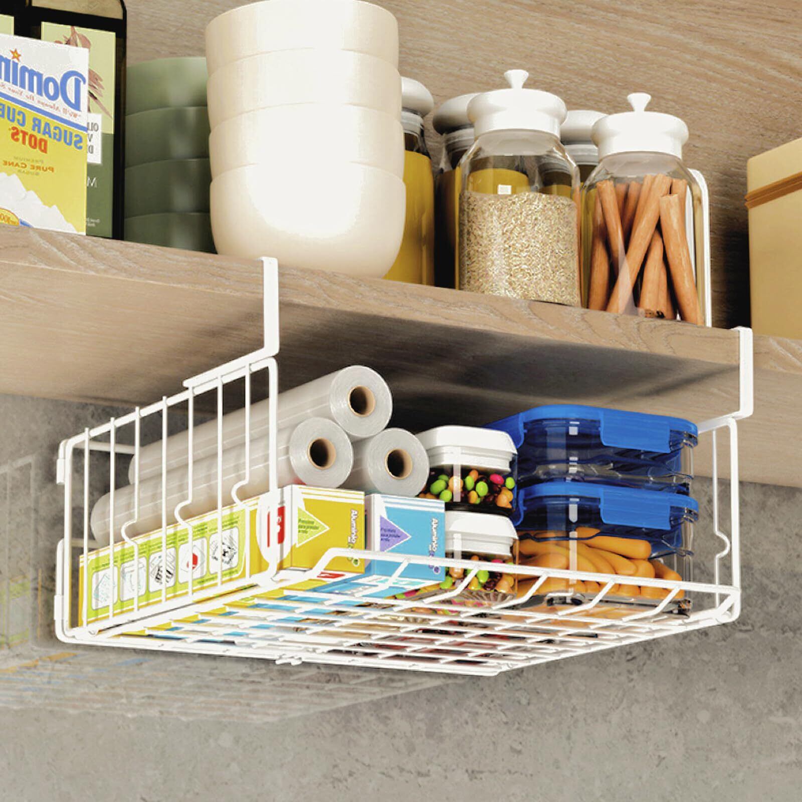 NATTY NING【吊り下げ収納バスケット 折りたたみ可能 積み重ね可能】 穴あけ不要 キッチン収納ラック 省スペース 落下防止設計 戸棚/キッチン収納用(ホワイト 1個セット)