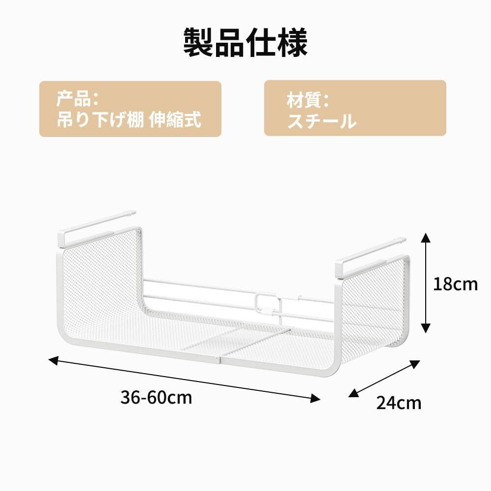 吊り下げ棚 伸縮式 差し込み式 戸棚下 吊り戸棚 収納ラック 吊り下げ ラック デスク下 戸棚下収納 吊戸棚 バスケット キッチン収納 掛け式 省スペース (ホワイト)