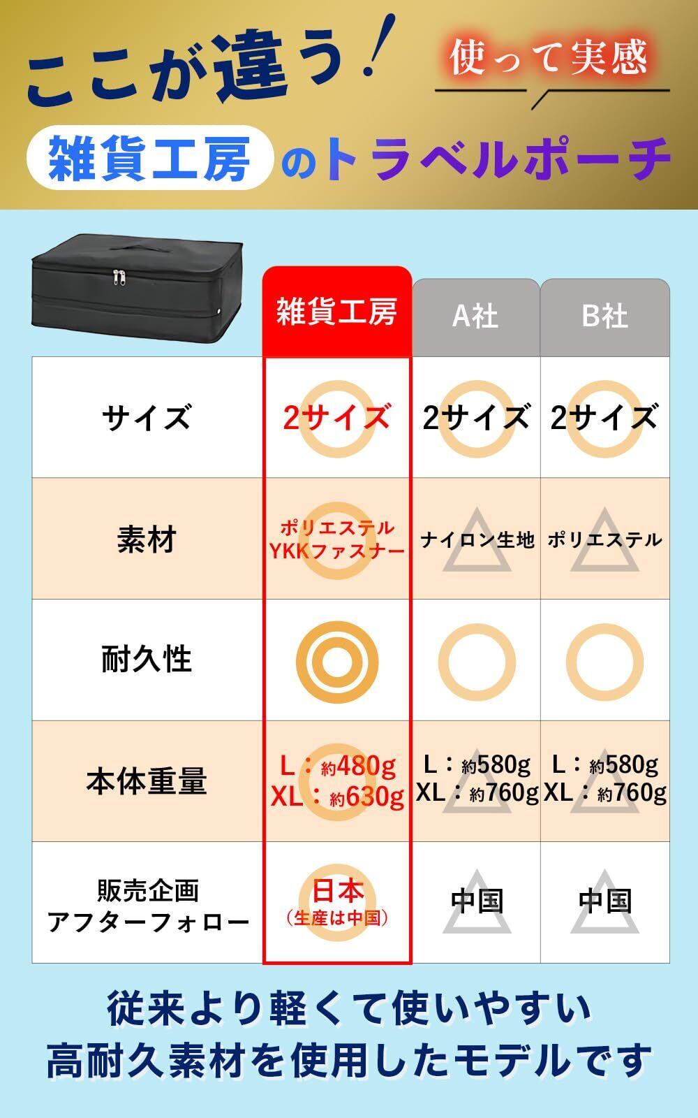 【軽くて高耐久】雑貨工房Beeのトラベルポーチは、他社従来品に比べて、約100gほど軽くなっており、収納バッグが重いと感じさせません。ファスナーにはYKK製ファスナーを採用し、耐久性や開閉時のストレスを低減します。