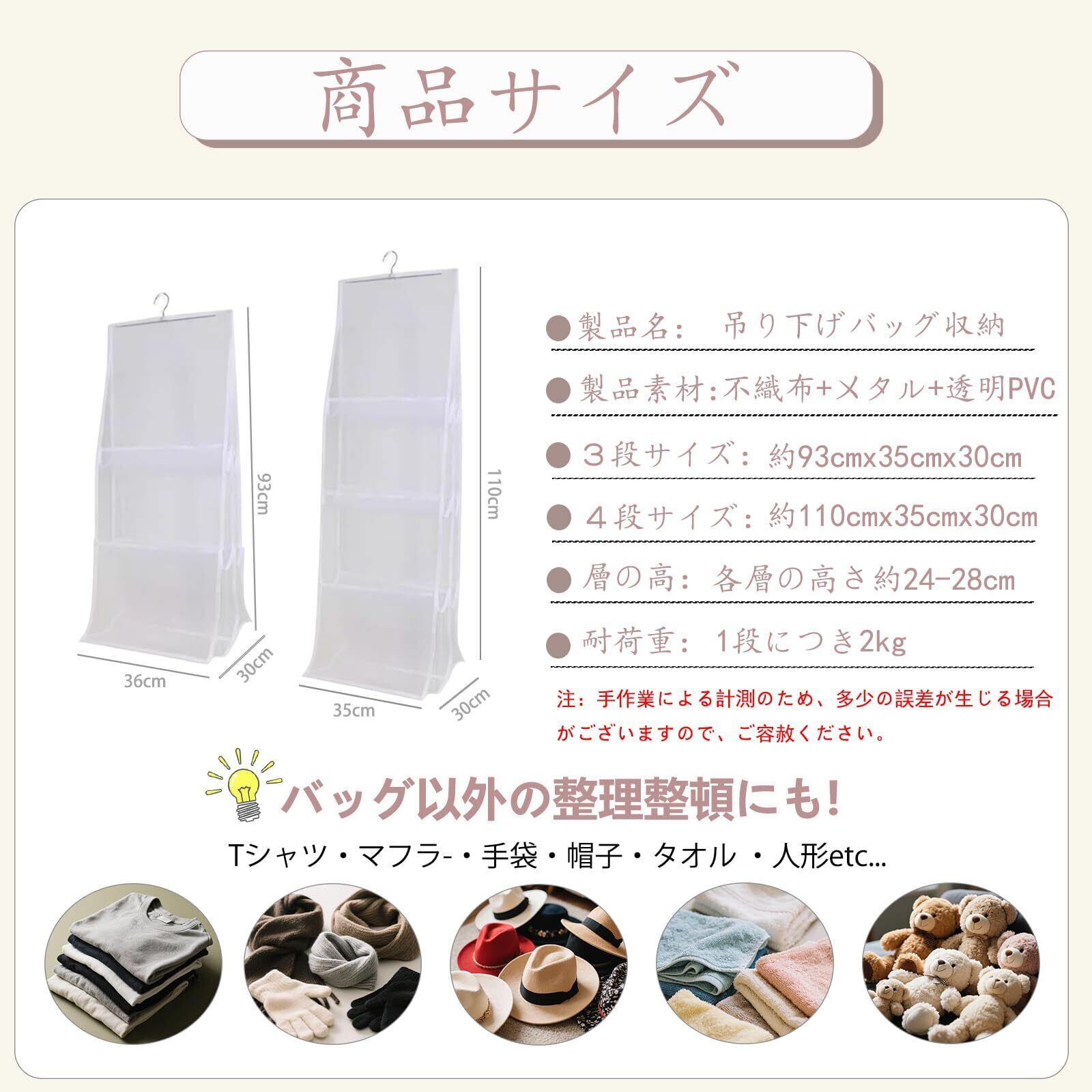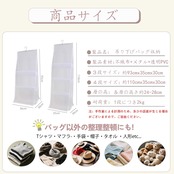 【高品質の素材】材質・成分:本体:ポリプロピレン不織布+PVC、上部:金属製フック。品質の良い不織布素材を採用するので、通気性も良く、耐久性に優れています。PVCの素材で大切なバッグをカビ、チリ、キズや型崩れから守ります。防水性と防塵性も備えています。金属製フックは耐荷重性に優れて、耐久性があり、美しく実用的です。