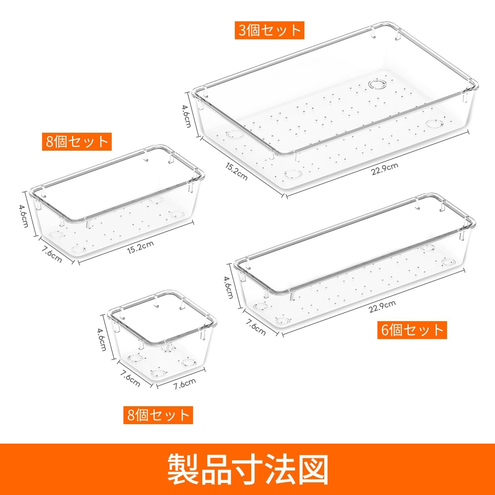 透明度の高い素材:素材は見事な水晶のように透き通った素材です。このプラスチック製の引き出し整理グッズは、引き出しの中を明るく照らし、きちんと整理できるスペースを作ってくれます。透明なデザインで、必要なときに必要なものをすぐに見つけることができます。