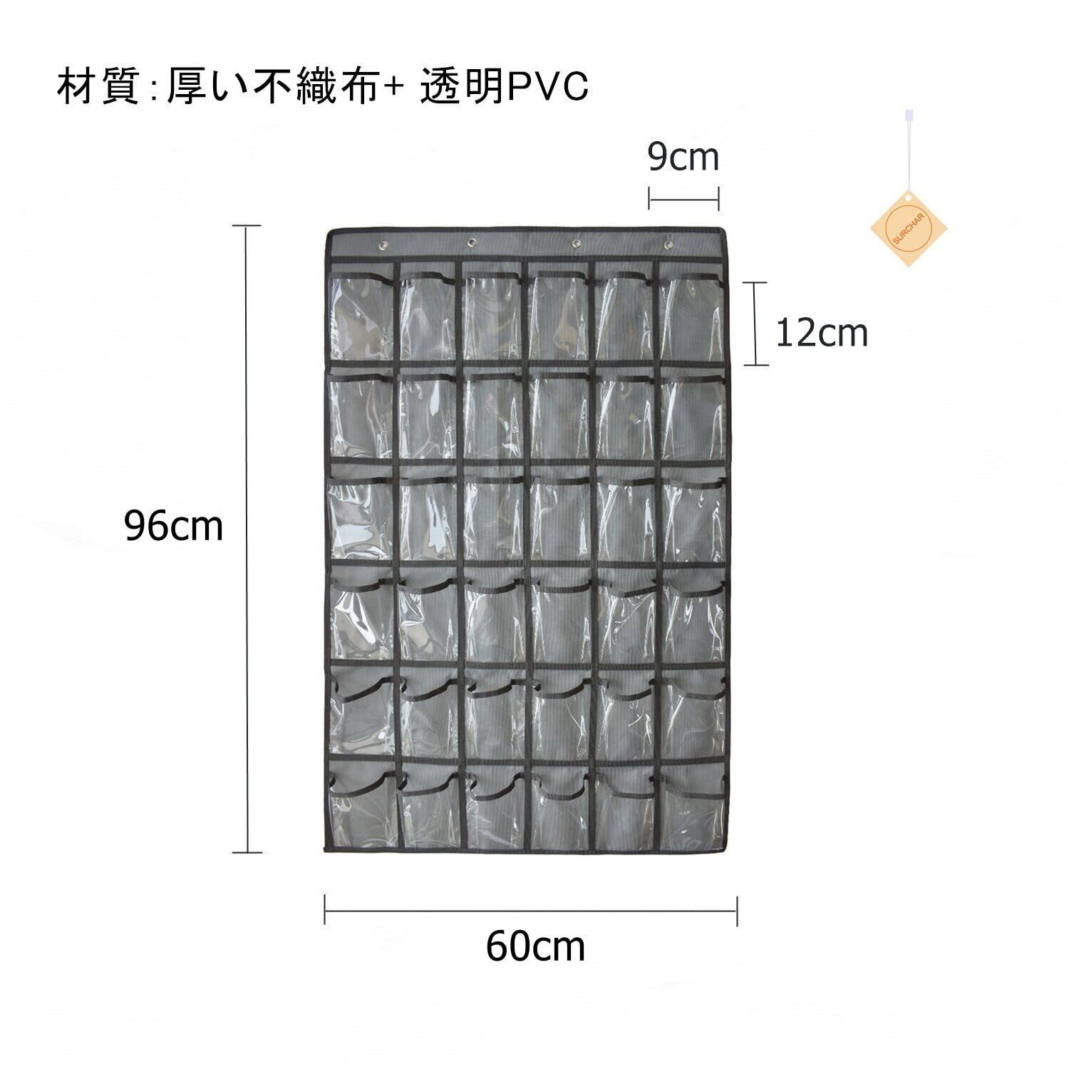 【仕様】2サイズ: 36ポケット: 横60cm高さ96cm、重量約0.35kg。12ポケット: 横30.5cm高さ66.5cm、重量約0.15kg。それぞれのポケット: 横9cm高さ12cm 。36ポケットには4つのフックが付いています、12ポケットには2つのフックが付いています。クリア カレンダーポケット。