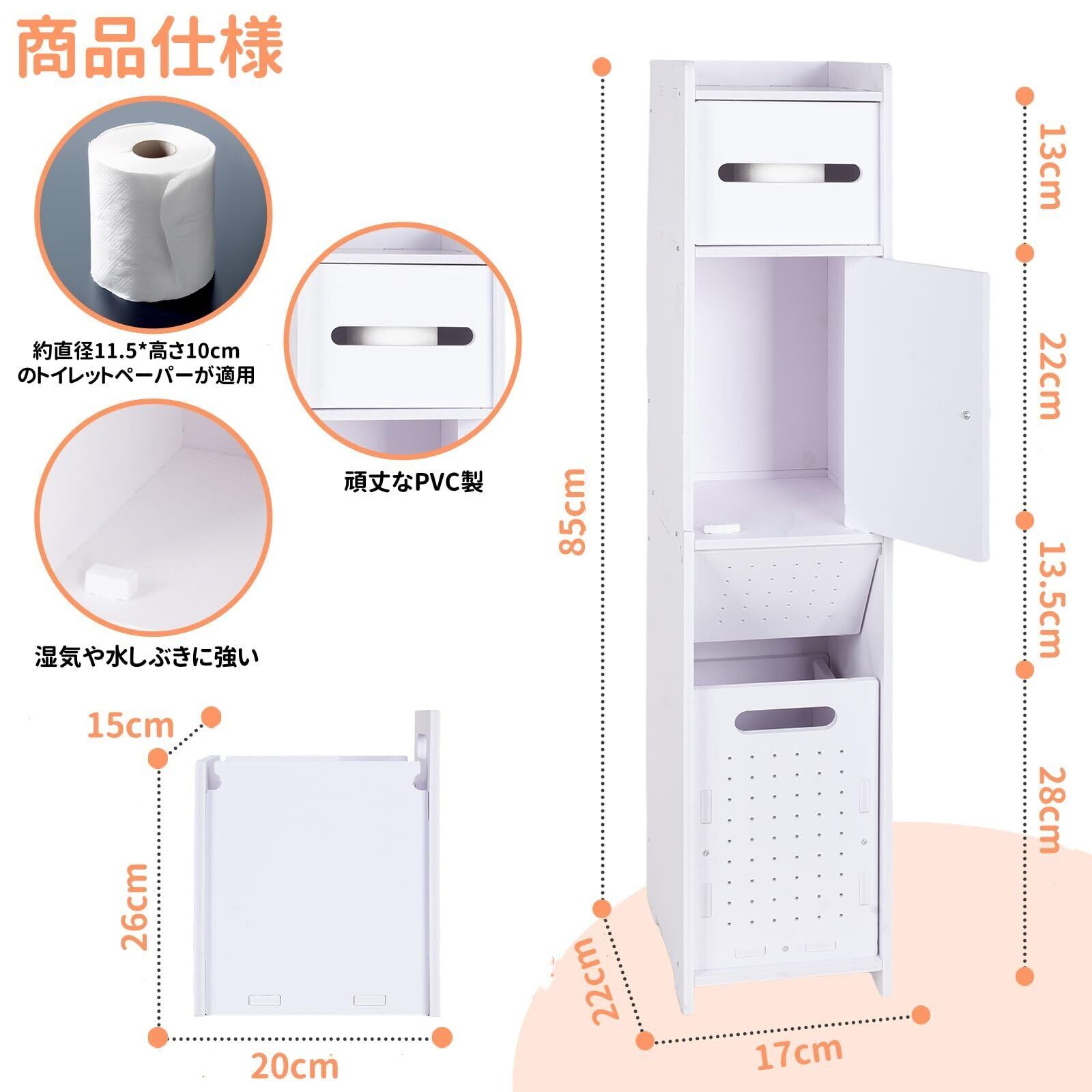【狭いトイレでも置けるサイズ】サイズは約幅17*奥行22*高さ85cmで、スリムなサイズ設計なのに、トイレットペーパーやトイレ用品をひとまとめに収納できる優れもの!縦型のスリムな設計で邪魔にならないサイズ感、省スペースに収納空間を作るため、徹底的にスリムなデザインにこだわりました。