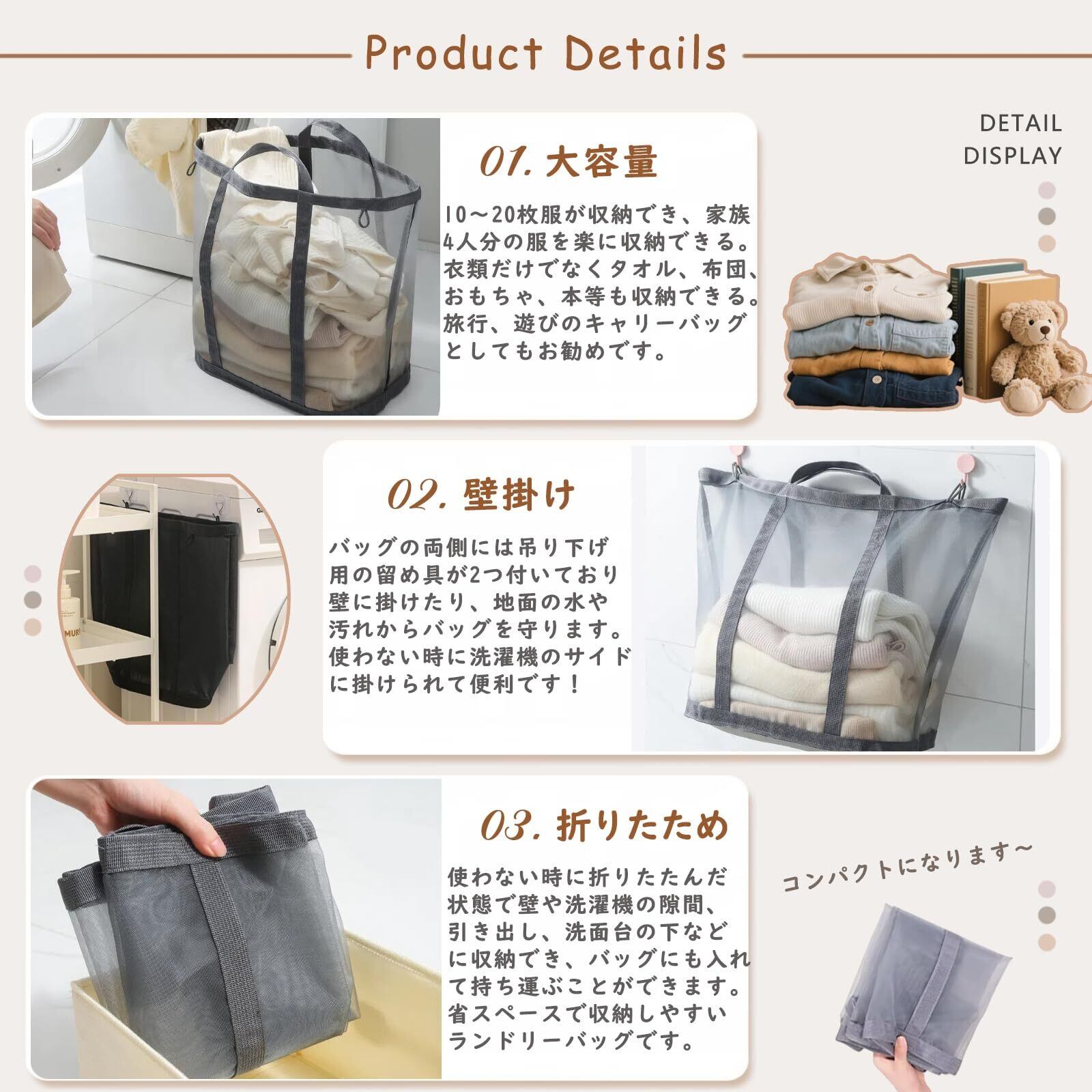 【幅広く活躍する収納バッグ】このメッシュ洗濯かごは、衣類、寝具、ベビーアイテム、スポーツ用品、おもちゃなどを収納できます。家庭用の収納バッグとしては最適です。浴室、寝室、ジム、旅行、温泉、自動車、海辺など様々なシーンに活躍します。また、エコバッグ、プールバッグとしてもご使用いただけます。