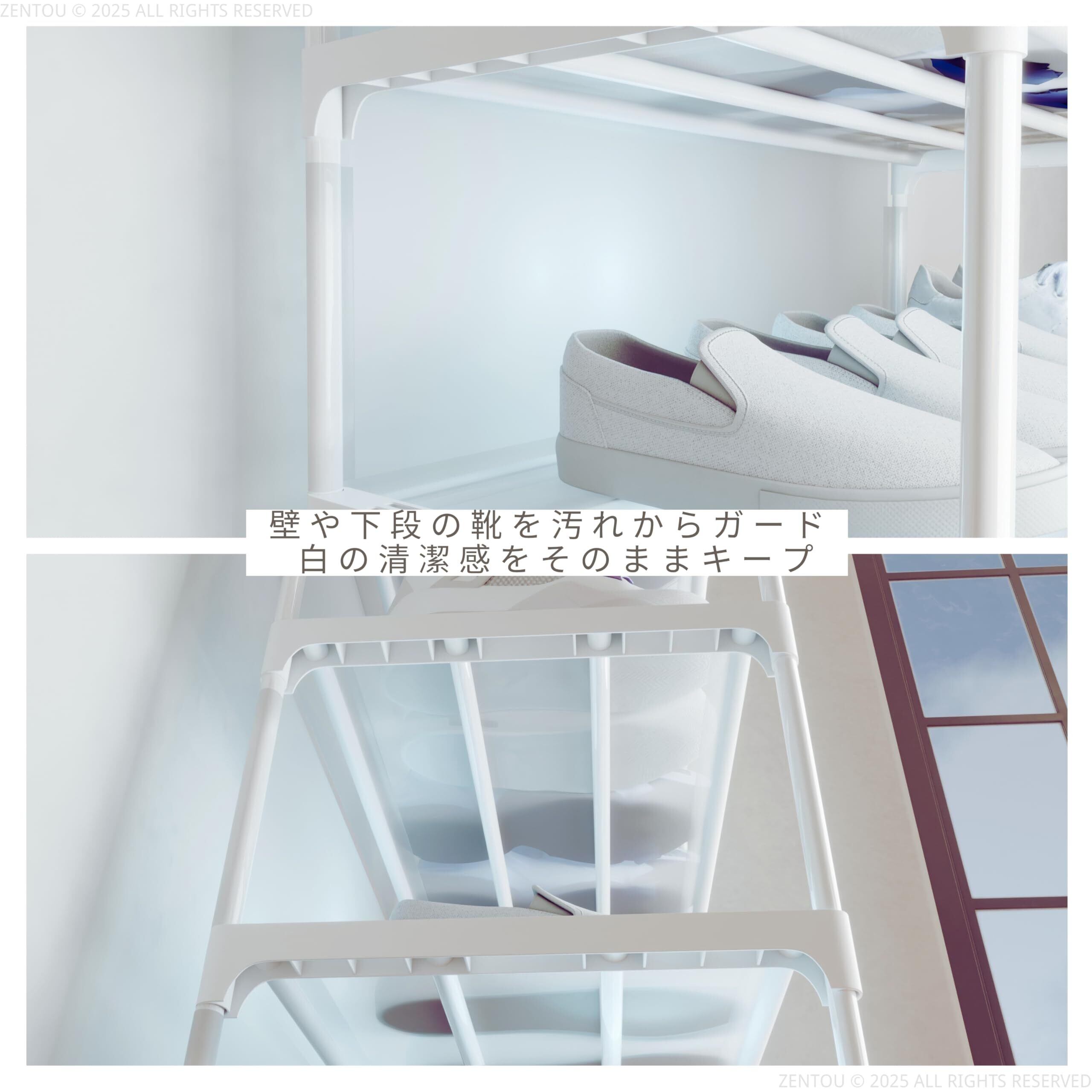 高耐荷重・壁面保護に優れた白いシューズラック スチールパイプとPPシートでしっかり支え、高耐荷重を実現。靴収納だけでなく、本棚や雑貨収納としても使えるマルチシューズラック 白です。壁面接触部分にはPPシートを採用し、壁面を傷や汚れから保護します。靴箱 白やシューズラック おしゃれ 白としてもおすすめです。子供用靴箱 白や靴しゅうのう ラック 白としても最適です。スリムシューズラック 白や靴箱 高さ調節可能 白としても使えます。