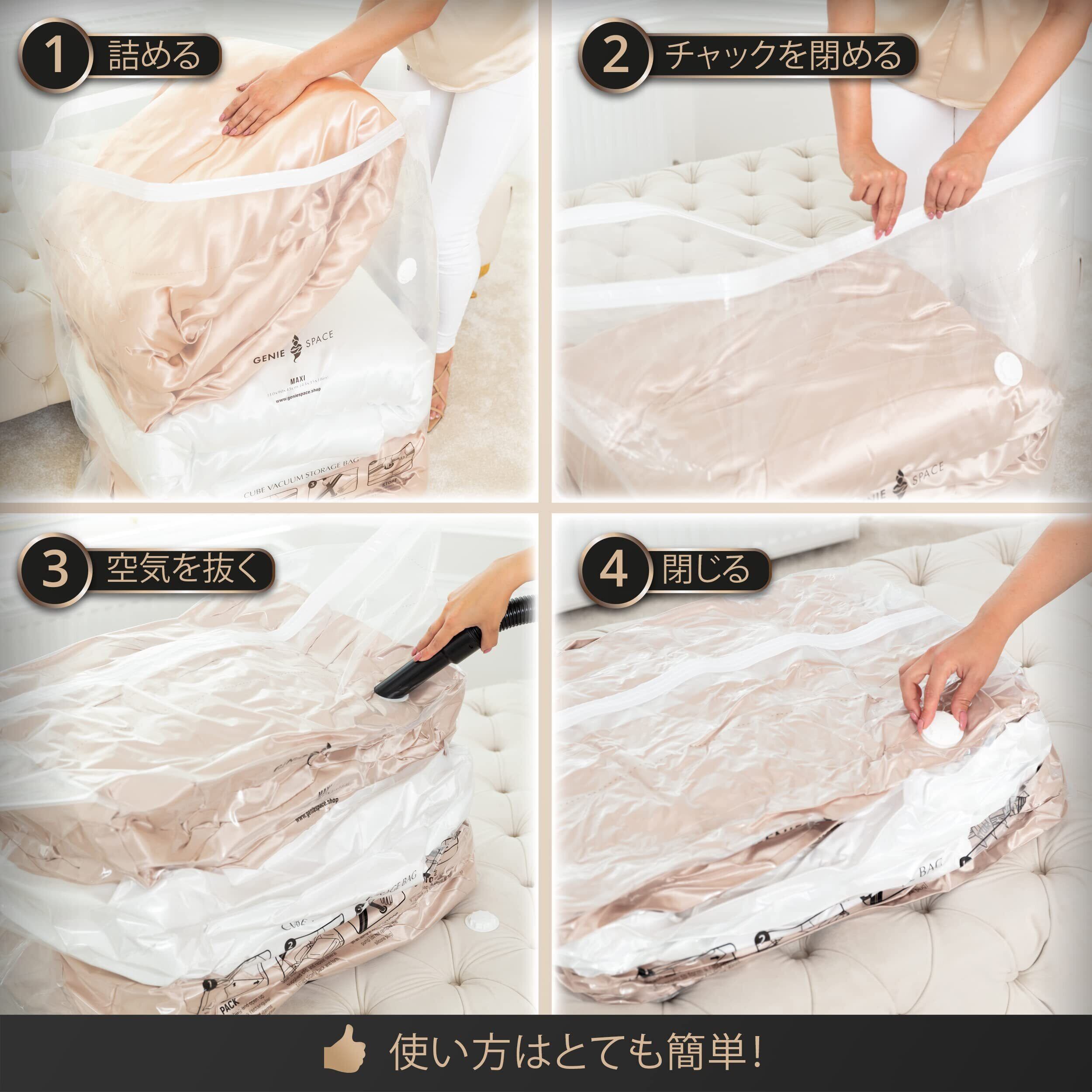 80%以上のスペースを確保 - この衣類収納袋は、元サイズの約80%まで圧縮することができます(4倍のスペースが確保できます)。衣類の収納だけでなく、掛け布団、カーテン、寝具、タオル、クッション、ぬいぐるみなど、様々なものの収納にお使いいただけます!圧縮後は、GENIE SPACE収納袋をクローゼット収納やベッド下収納、ロフト、ガレージなどに、また必要な時まで置いておくだけです!